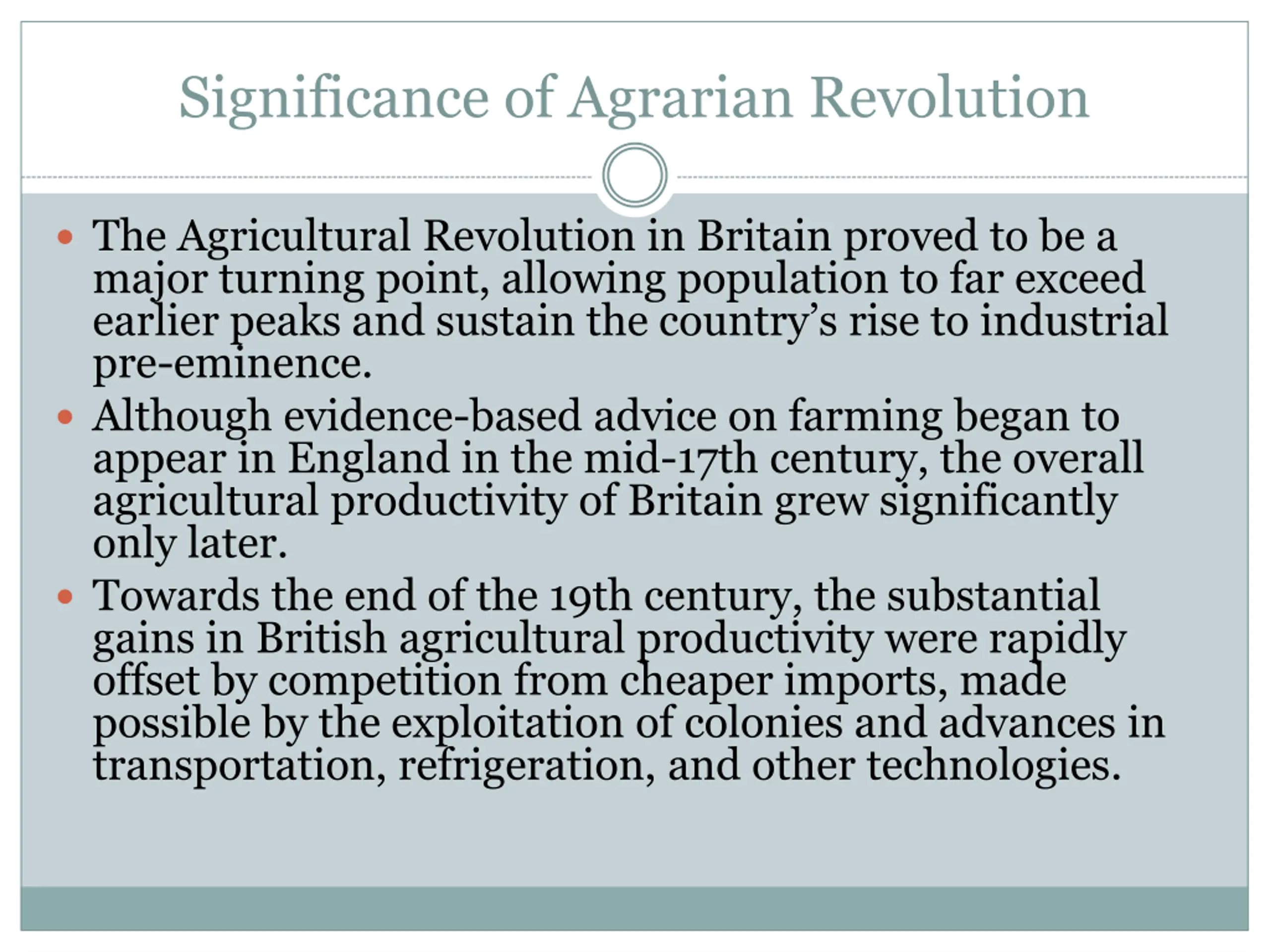 Significance of Agrarian Revolution The Agricultural Revolution in Britain proved to be a major turning point, allowing population to far exceed earlier peaks and sustain the country s rise to industrial pre-eminence. Although evidence-based advice on farming began to appear in England in the mid-17th century, the overall agricultural productivity of Britain grew significantly only later. Towards the end of the 19th century, the substantial gains in British agricultural productivity were rapidly offset by competition from cheaper imports, made possible by the exploitation of colonies and advances in transportation, refrigeration, and other technologies.