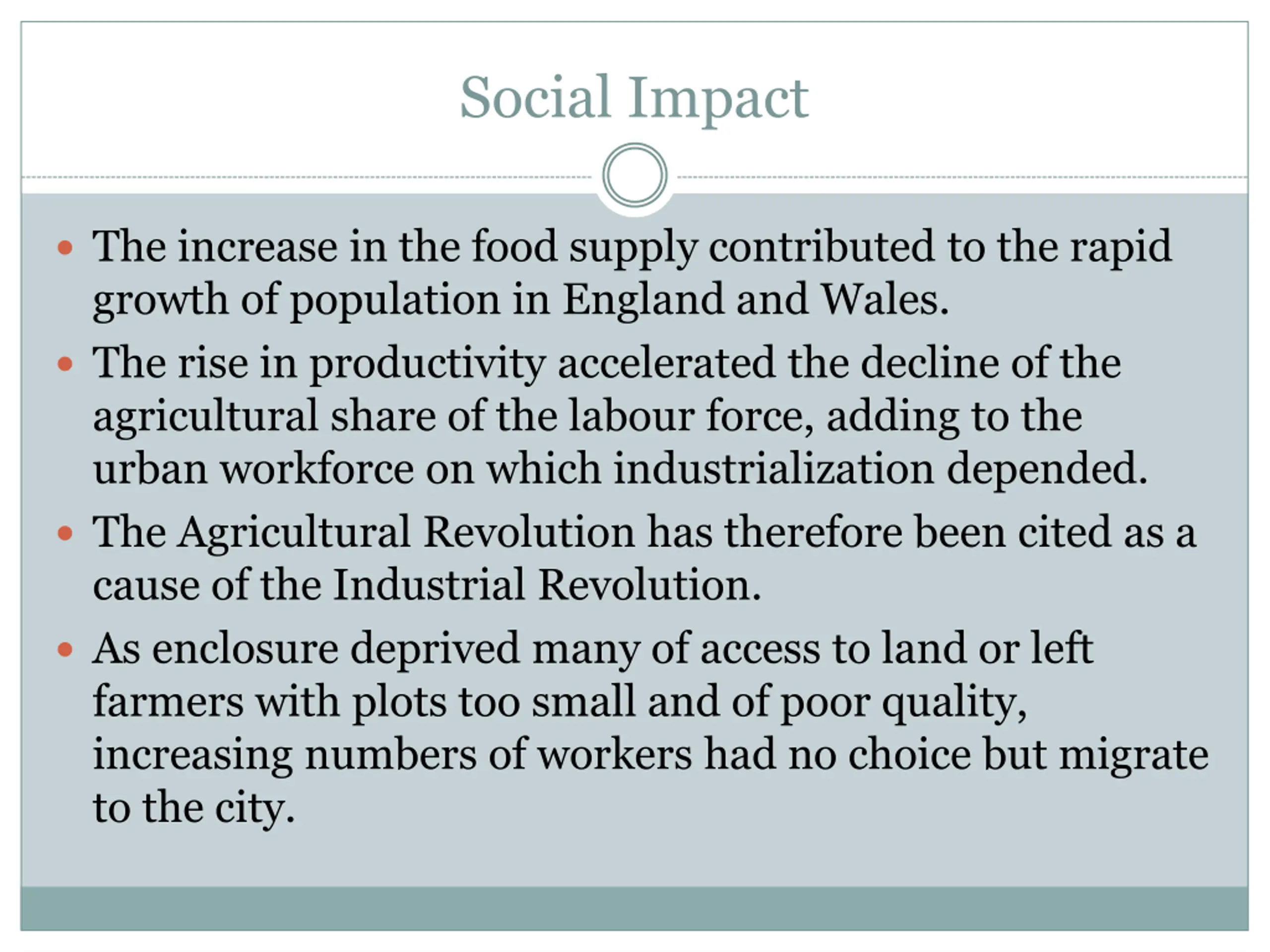 Social Impact The increase in the food supply contributed to the rapid growth of population in England and Wales. The rise in productivity accelerated the decline of the agricultural share of the labour force, adding to the urban workforce on which industrialization depended. The Agricultural Revolution has therefore been cited as a cause of the Industrial Revolution. As enclosure deprived many of access to land or left farmers with plots too small and of poor quality, increasing numbers of workers had no choice but migrate to the city.