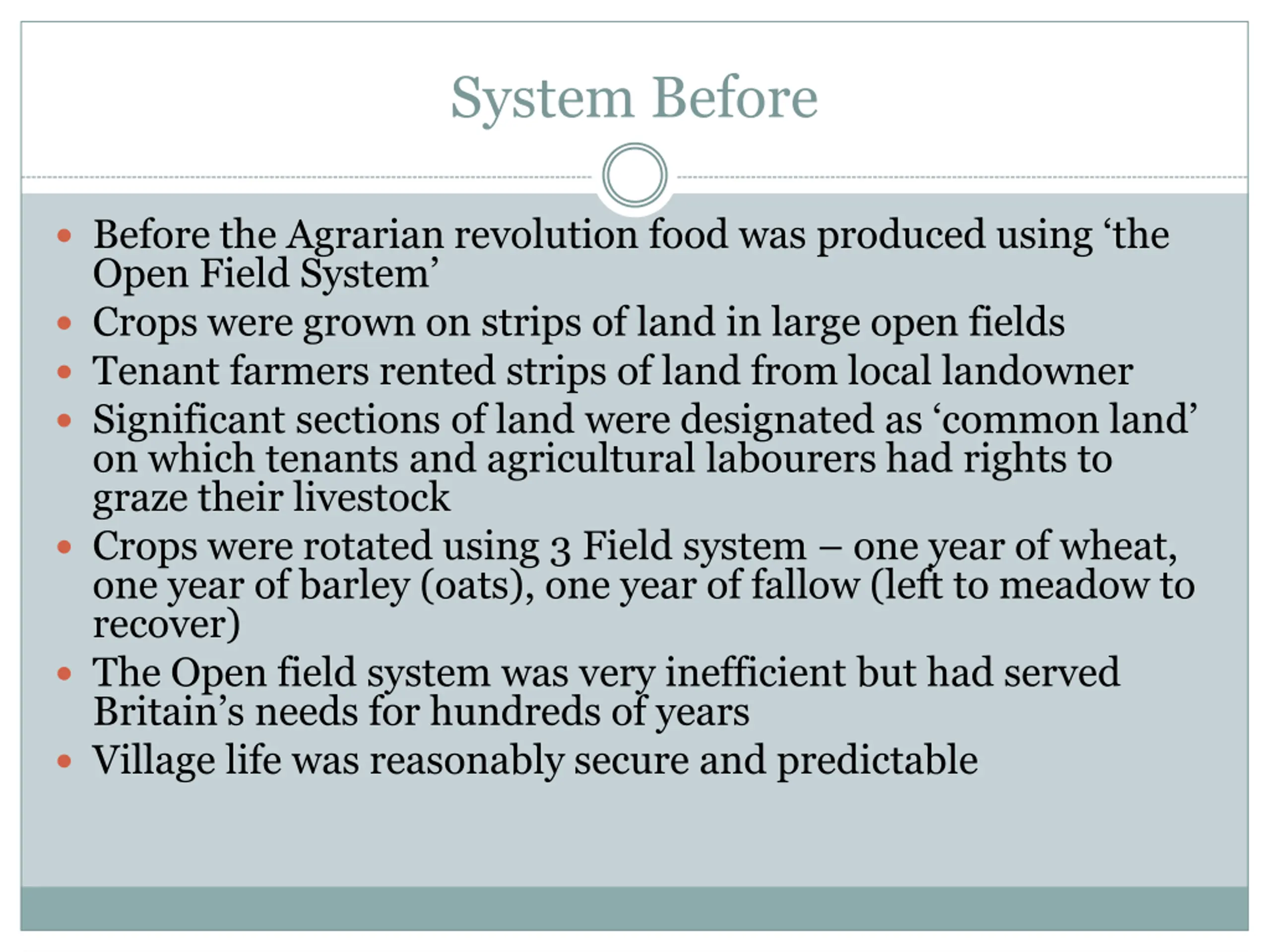 System Before Before the Agrarian revolution food was produced using the Open Field System Crops were grown on strips of land in large open fields Tenant farmers rented strips of land from local landowner Significant sections of land were designated as common land on which tenants and agricultural labourers had rights to graze their livestock Crops were rotated using 3 Field system one year of wheat, one year of barley (oats), one year of fallow (left to meadow to recover) The Open field system was very inefficient but had served Britain s needs for hundreds of years Village life was reasonably secure and predictable