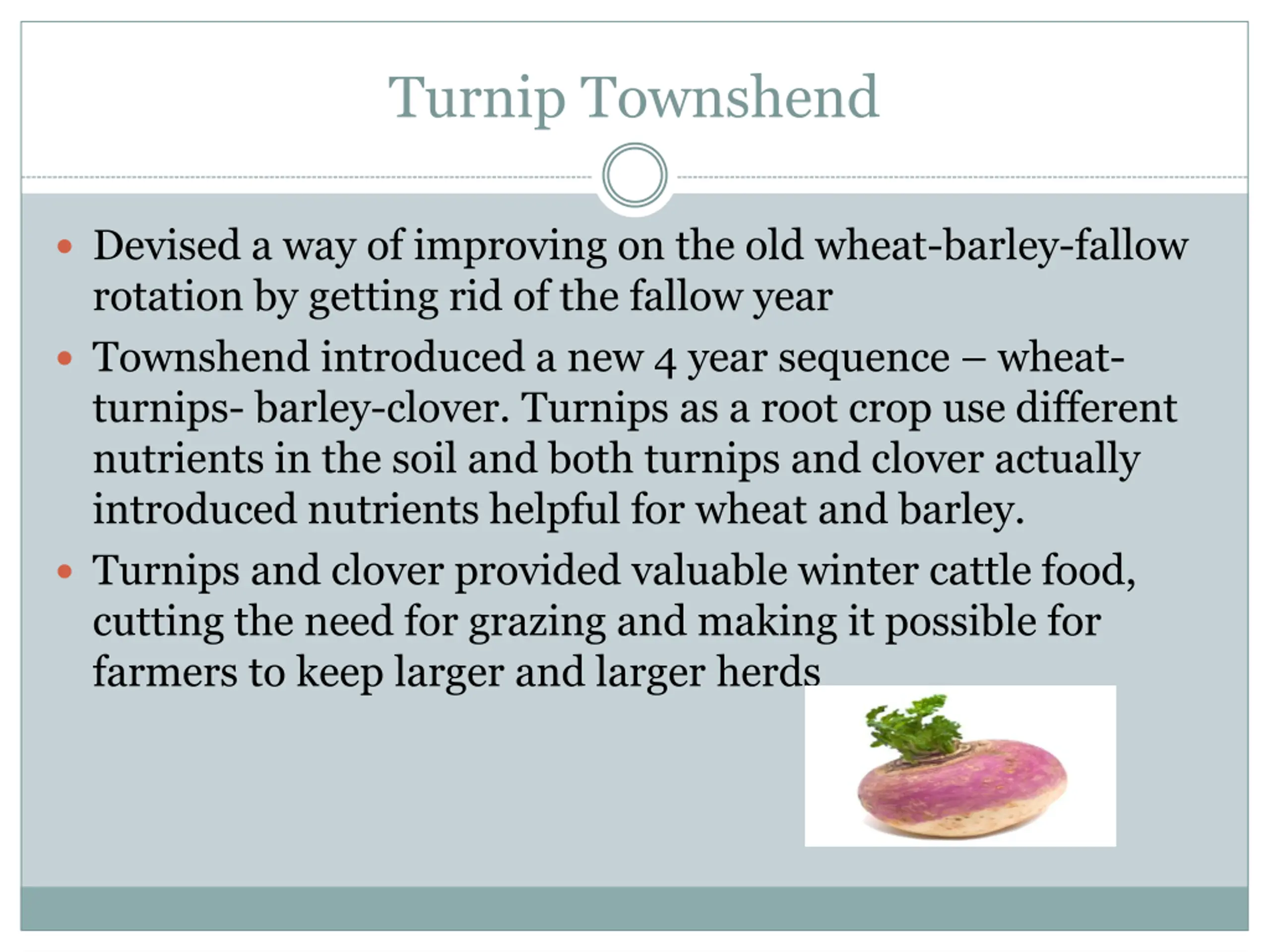 Turnip Townshend Devised a way of improving on the old wheat-barley-fallow rotation by getting rid of the fallow year Townshend introduced a new 4 year sequence wheat- turnips- barley-clover. Turnips as a root crop use different nutrients in the soil and both turnips and clover actually introduced nutrients helpful for wheat and barley. Turnips and clover provided valuable winter cattle food, cutting the need for grazing and making it possible for farmers to keep larger and larger herds