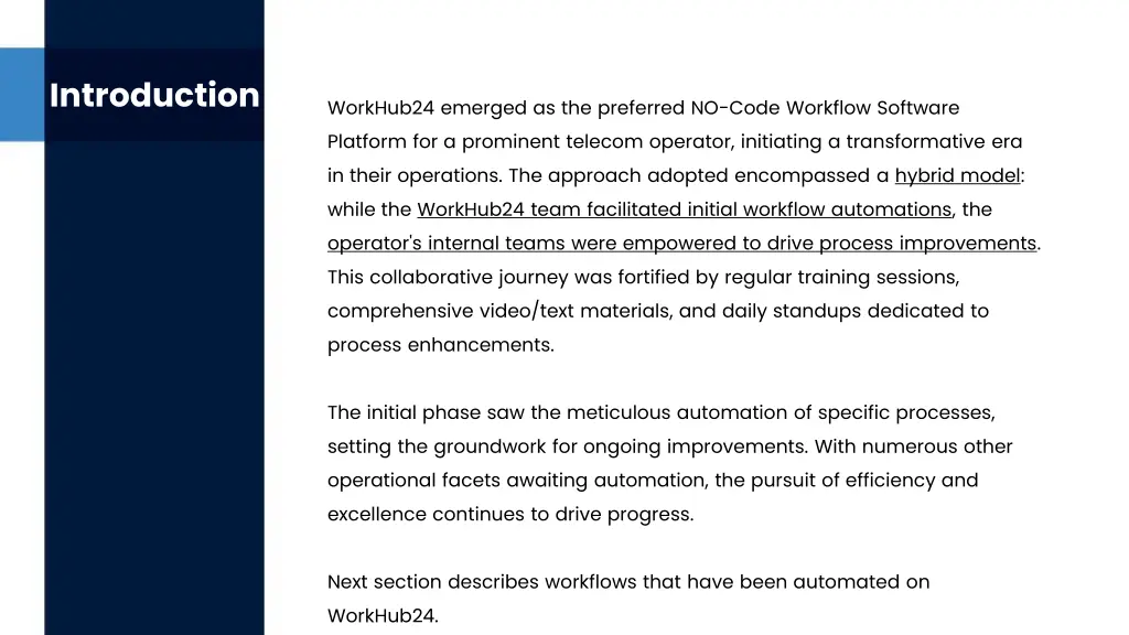 Introduction WorkHub24 emerged as the preferred NO-Code Workflow Software Platform for a prominent telecom operator, initiating a transformative era in their operations. The approach adopted encompassed a hybrid model: while the WorkHub24 team facilitated initial workflow automations, the operator's internal teams were empowered to drive process improvements. This collaborative journey was fortified by regular training sessions, comprehensive video/text materials, and daily standups dedicated to process enhancements. The initial phase saw the meticulous automation of specific processes, setting the groundwork for ongoing improvements. With numerous other operational facets awaiting automation, the pursuit of efficiency and excellence continues to drive progress. Next section describes workflows that have been automated on WorkHub24.