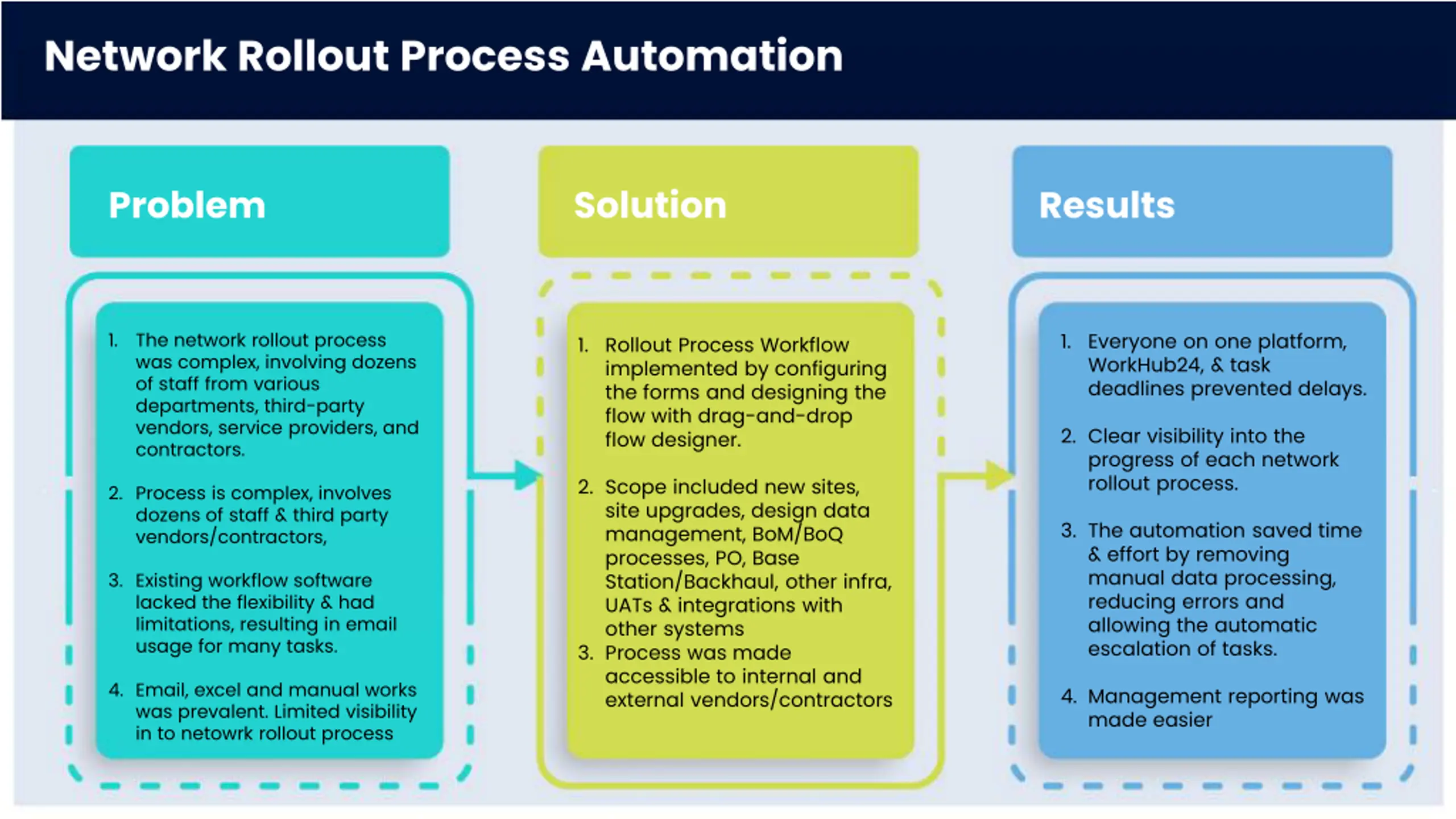 Network Rollout Process Automation Problem Solution Results 1. Everyone on one platform, WorkHub24, & task deadlines prevented delays. 1. The network rollout process was complex, involving dozens of staff from various departments, third-party vendors, service providers, and contractors. 1. Rollout Process Workflow implemented by configuring the forms and designing the flow with drag-and-drop flow designer. 2. Clear visibility into the progress of each network rollout process. 2. Scope included new sites, site upgrades, design data management, BoM/BoQ processes, PO, Base Station/Backhaul, other infra, UATs & integrations with other systems 3. Process was made accessible to internal and external vendors/contractors 2. Process is complex, involves dozens of staff & third party vendors/contractors, 3. The automation saved time & effort by removing manual data processing, reducing errors and allowing the automatic escalation of tasks. 3. Existing workflow software lacked the flexibility & had limitations, resulting in email usage for many tasks. 4. Email, excel and manual works was prevalent. Limited visibility in to netowrk rollout process 4. Management reporting was made easier