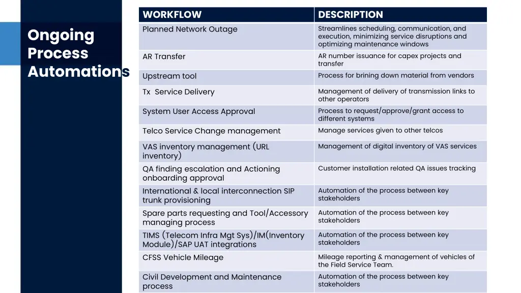 WORKFLOW Planned Network Outage DESCRIPTION Streamlines scheduling, communication, and execution, minimizing service disruptions and optimizing maintenance windows AR number issuance for capex projects and transfer Process for brining down material from vendors Ongoing Process Automations AR Transfer Upstream tool Tx Service Delivery Management of delivery of transmission links to other operators Process to request/approve/grant access to different systems Manage services given to other telcos System User Access Approval Telco Service Change management VAS inventory management (URL inventory) QA finding escalation and Actioning onboarding approval International & local interconnection SIP trunk provisioning Spare parts requesting and Tool/Accessory managing process TIMS (Telecom Infra Mgt Sys)/IM(Inventory Module)/SAP UAT integrations CFSS Vehicle Mileage Management of digital inventory of VAS services Customer installation related QA issues tracking Automation of the process between key stakeholders Automation of the process between key stakeholders Automation of the process between key stakeholders Mileage reporting & management of vehicles of the Field Service Team. Automation of the process between key stakeholders Civil Development and Maintenance process
