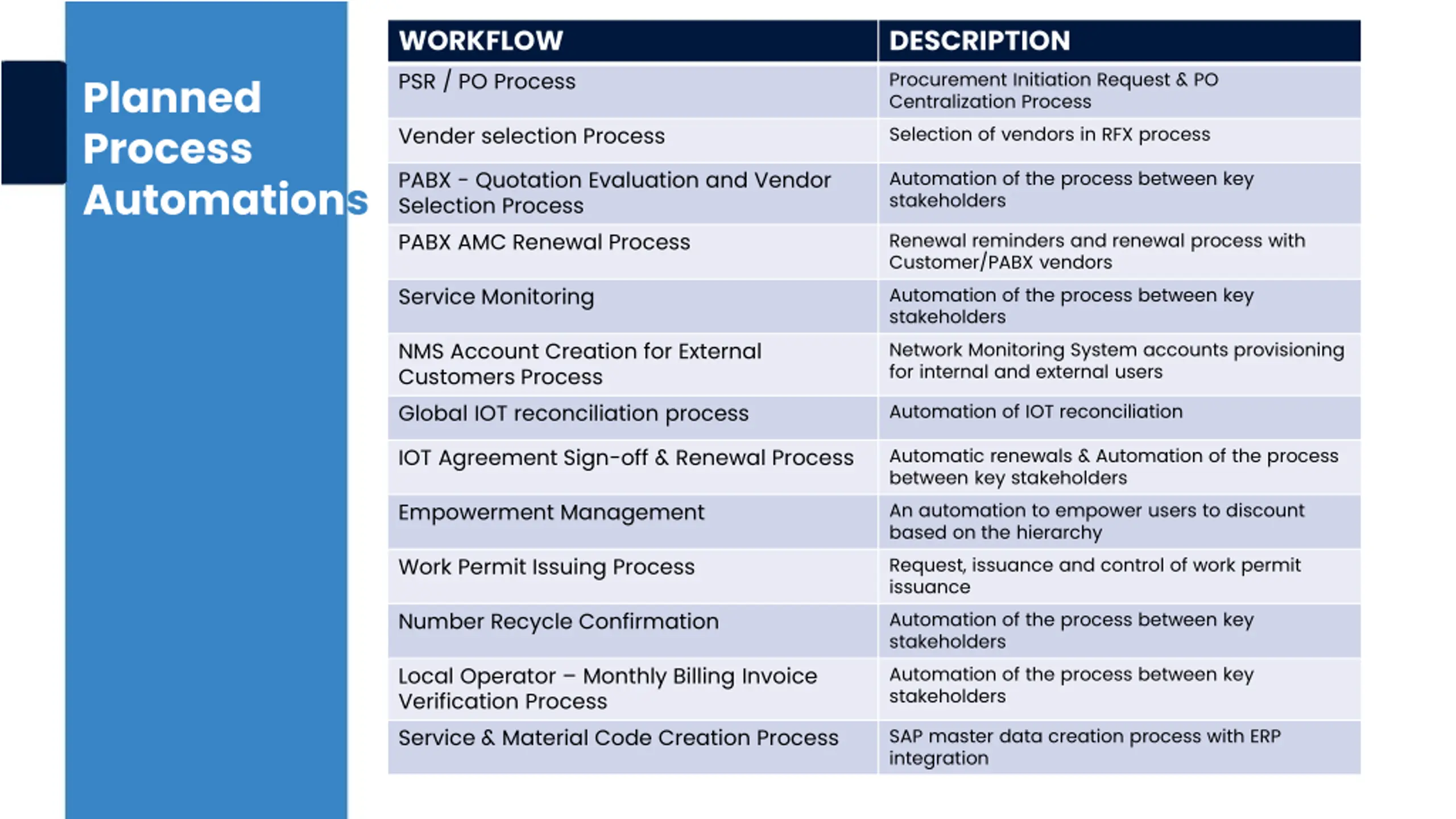 WORKFLOW PSR / PO Process DESCRIPTION Procurement Initiation Request & PO Centralization Process Selection of vendors in RFX process Planned Process Automations Vender selection Process PABX - Quotation Evaluation and Vendor Selection Process PABX AMC Renewal Process Automation of the process between key stakeholders Renewal reminders and renewal process with Customer/PABX vendors Automation of the process between key stakeholders Network Monitoring System accounts provisioning for internal and external users Service Monitoring NMS Account Creation for External Customers Process Global IOT reconciliation process Automation of IOT reconciliation IOT Agreement Sign-off & Renewal Process Automatic renewals & Automation of the process between key stakeholders An automation to empower users to discount based on the hierarchy Request, issuance and control of work permit issuance Automation of the process between key stakeholders Automation of the process between key stakeholders Empowerment Management Work Permit Issuing Process Number Recycle Confirmation Local Operator Monthly Billing Invoice Verification Process Service & Material Code Creation Process SAP master data creation process with ERP integration