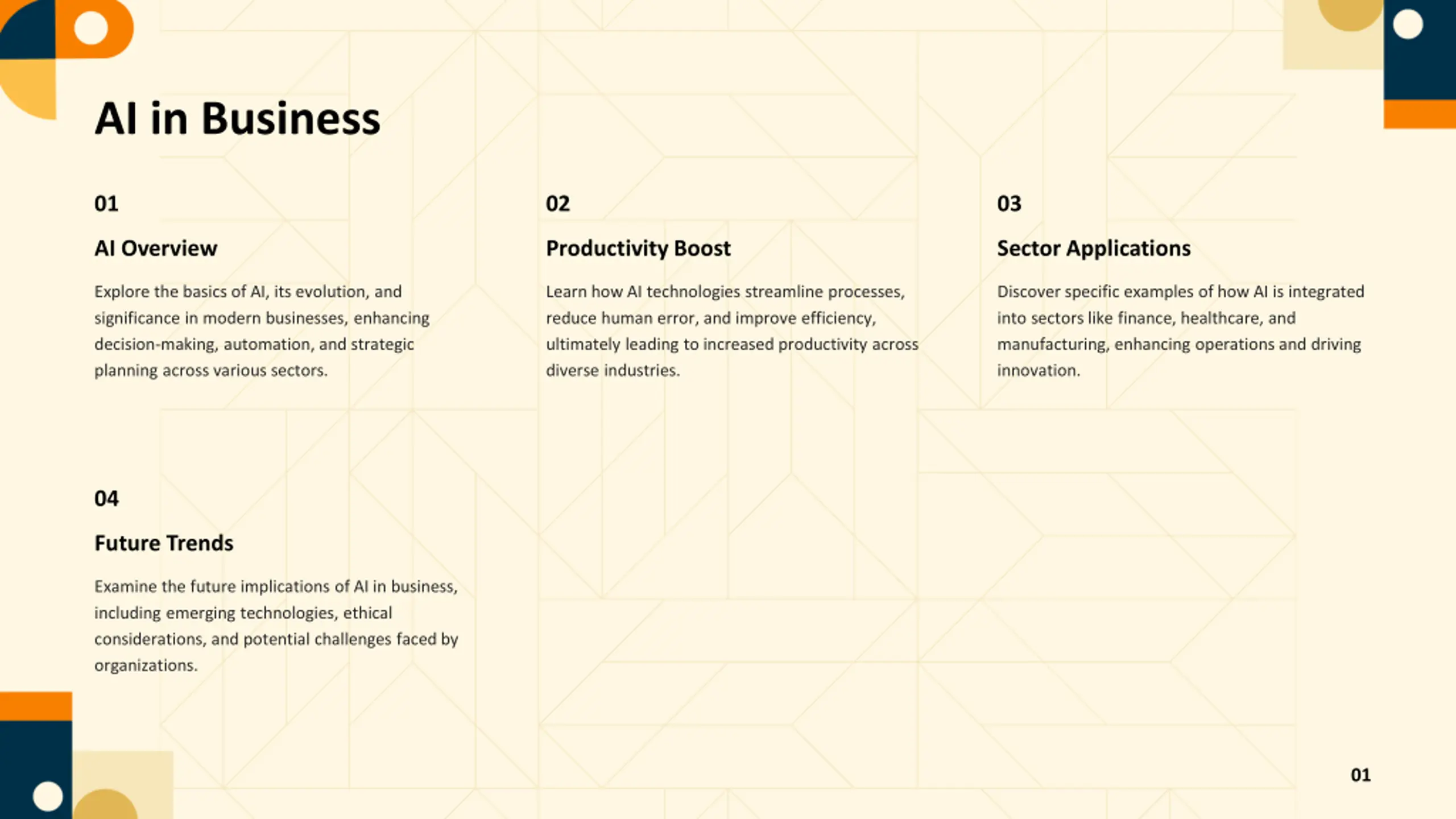 AI in Business 01 02 03 AI Overview Productivity Boost Sector Applications Explore the basics of AI, its evolution, and significance in modern businesses, enhancing decision-making, automation, and strategic planning across various sectors. Learn how AI technologies streamline processes, reduce human error, and improve efficiency, ultimately leading to increased productivity across diverse industries. Discover specific examples of how AI is integrated into sectors like finance, healthcare, and manufacturing, enhancing operations and driving innovation. 04 Future Trends Examine the future implications of AI in business, including emerging technologies, ethical considerations, and potential challenges faced by organizations. 01