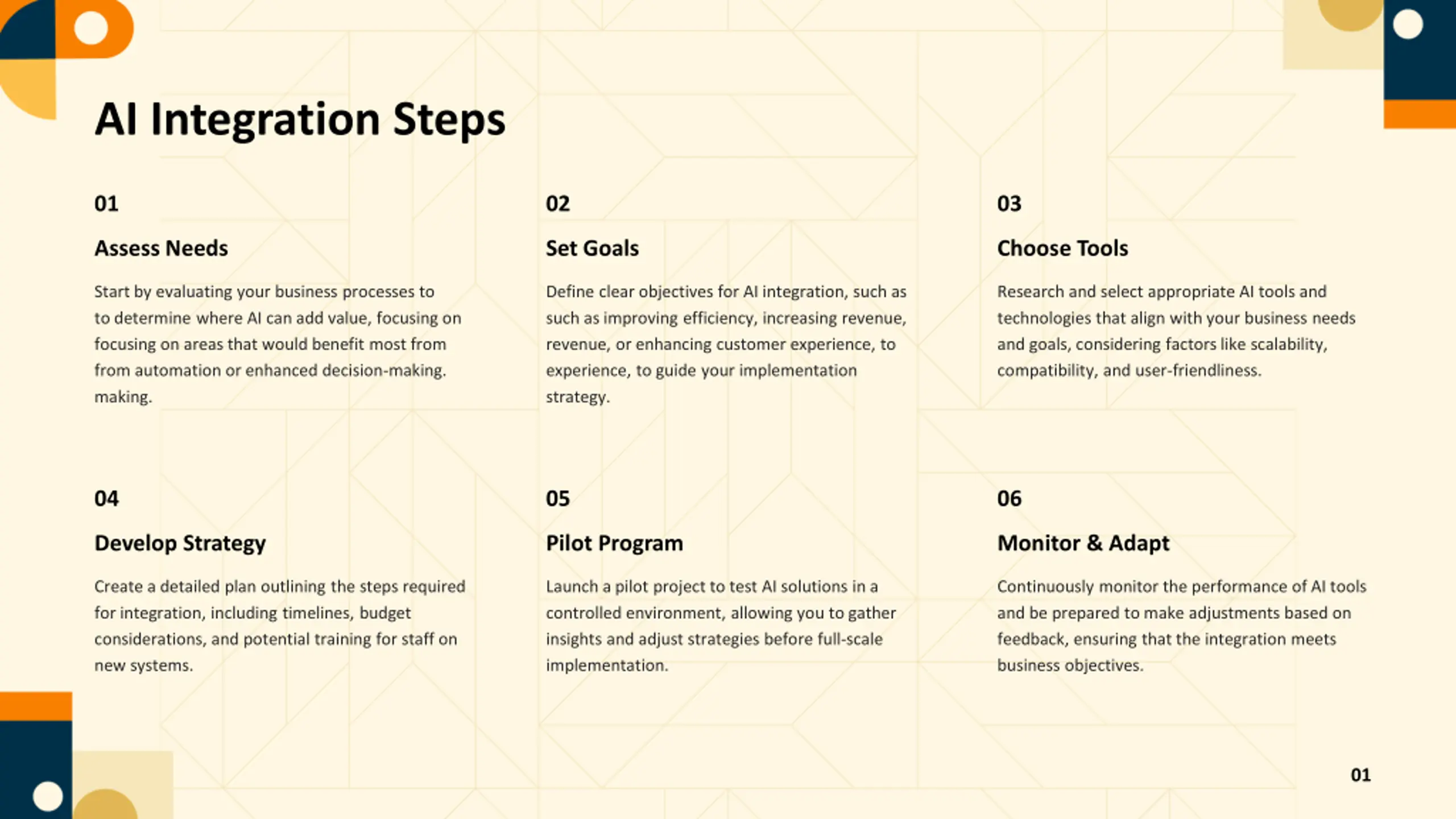 AI Integration Steps 01 02 03 Assess Needs Set Goals Choose Tools Start by evaluating your business processes to to determine where AI can add value, focusing on focusing on areas that would benefit most from from automation or enhanced decision- making. Define clear objectives for AI integration, such as such as improving efficiency, increasing revenue, revenue, or enhancing customer experience, to experience, to guide your implementation strategy. Research and select appropriate AI tools and technologies that align with your business needs and goals, considering factors like scalability, compatibility, and user-friendliness. making. 04 05 06 Develop Strategy Pilot Program Monitor & Adapt Create a detailed plan outlining the steps required for integration, including timelines, budget considerations, and potential training for staff on new systems. Launch a pilot project to test AI solutions in a controlled environment, allowing you to gather insights and adjust strategies before full-scale implementation. Continuously monitor the performance of AI tools and be prepared to make adjustments based on feedback, ensuring that the integration meets business objectives. 01