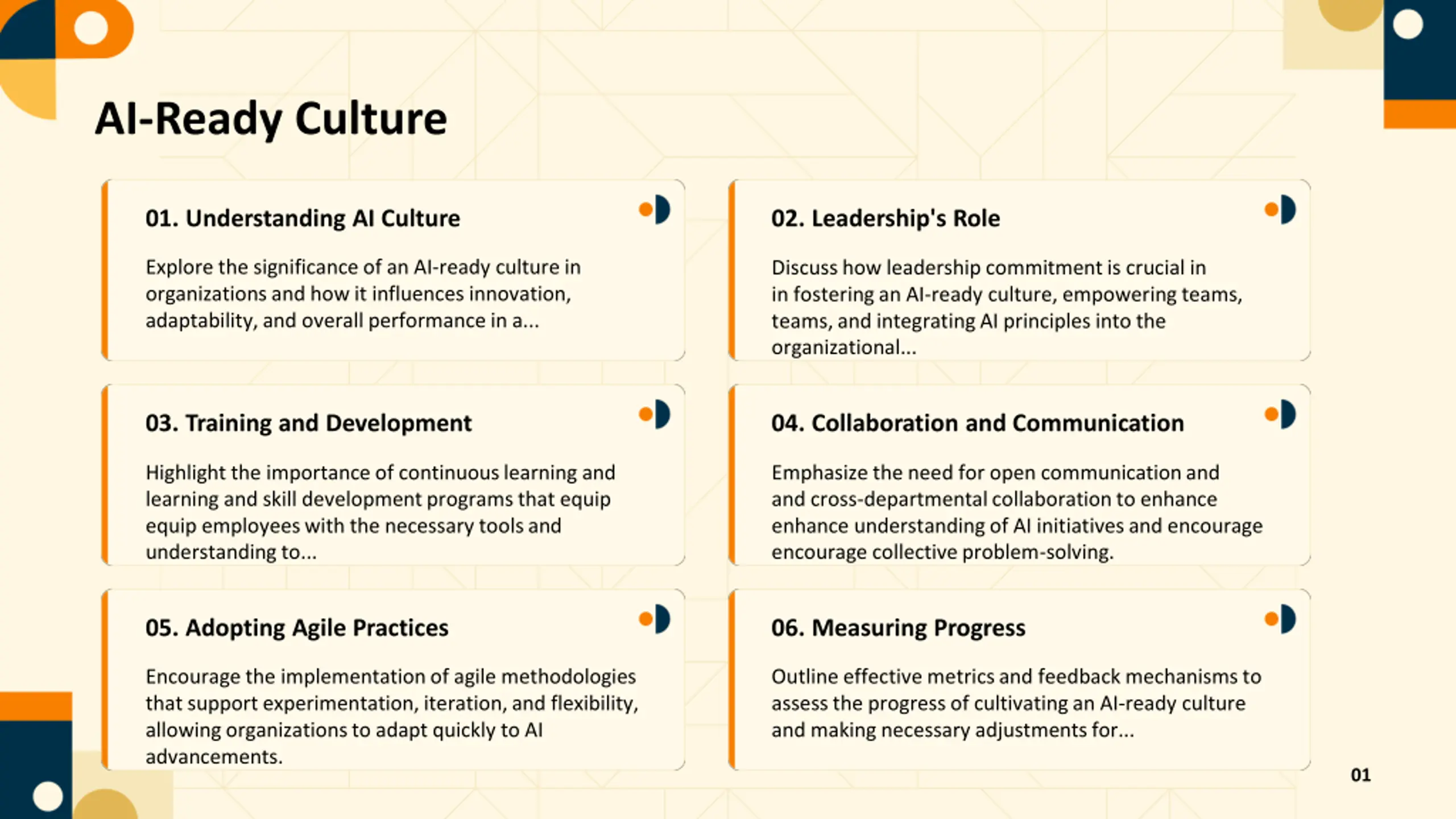 AI-Ready Culture 01. Understanding AI Culture 02. Leadership's Role Explore the significance of an AI-ready culture in organizations and how it influences innovation, adaptability, and overall performance in a... Discuss how leadership commitment is crucial in in fostering an AI-ready culture, empowering teams, teams, and integrating AI principles into the organizational... 04. Collaboration and Communication 03. Training and Development Highlight the importance of continuous learning and learning and skill development programs that equip equip employees with the necessary tools and understanding to... Emphasize the need for open communication and and cross-departmental collaboration to enhance enhance understanding of AI initiatives and encourage encourage collective problem-solving. 05. Adopting Agile Practices 06. Measuring Progress Encourage the implementation of agile methodologies that support experimentation, iteration, and flexibility, allowing organizations to adapt quickly to AI advancements. Outline effective metrics and feedback mechanisms to assess the progress of cultivating an AI-ready culture and making necessary adjustments for... 01