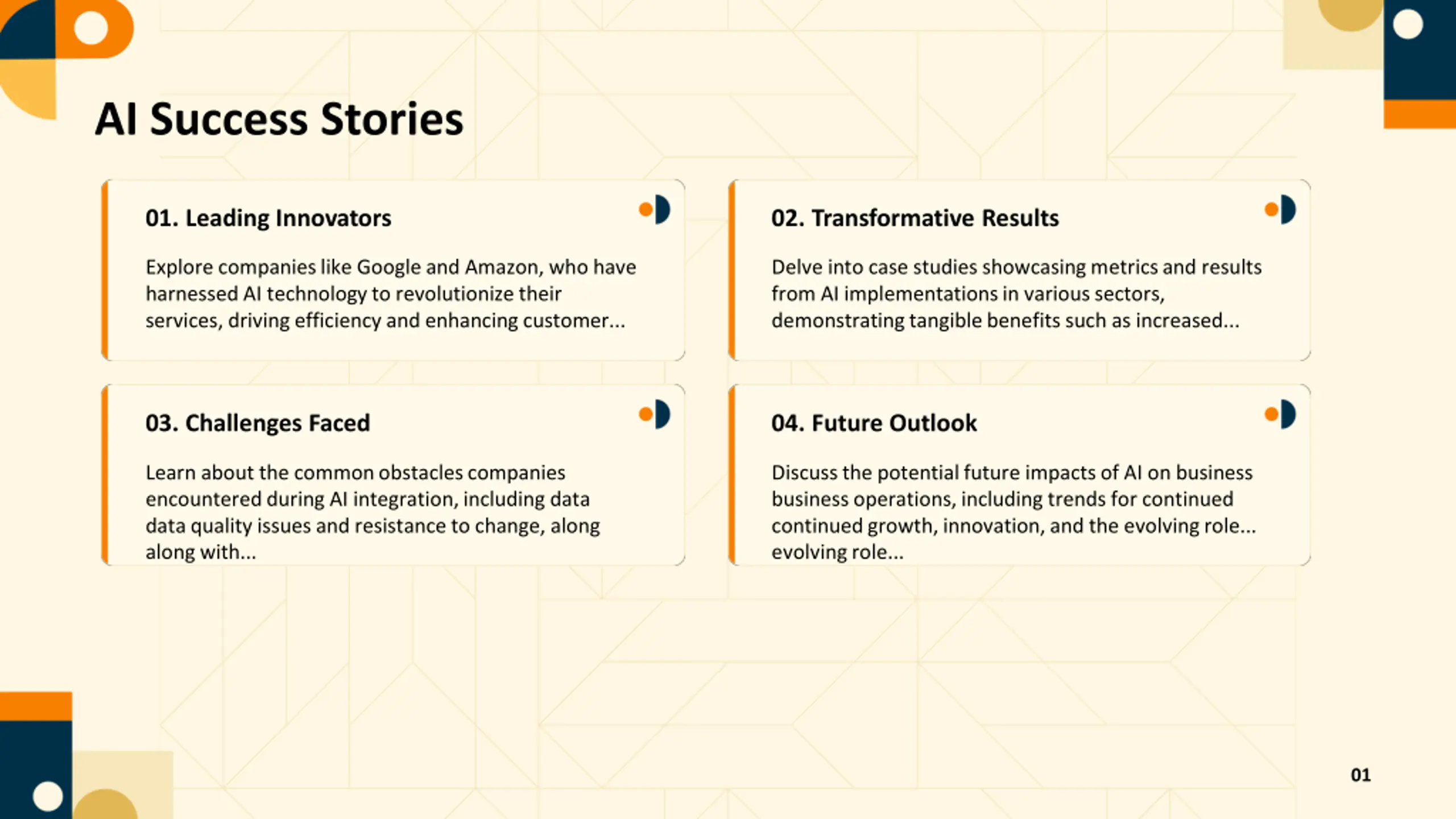 AI Success Stories 01. Leading Innovators 02. Transformative Results Explore companies like Google and Amazon, who have harnessed AI technology to revolutionize their services, driving efficiency and enhancing customer... Delve into case studies showcasing metrics and results from AI implementations in various sectors, demonstrating tangible benefits such as increased... 03. Challenges Faced 04. Future Outlook Learn about the common obstacles companies encountered during AI integration, including data data quality issues and resistance to change, along along with... Discuss the potential future impacts of AI on business business operations, including trends for continued continued growth, innovation, and the evolving role... evolving role... 01
