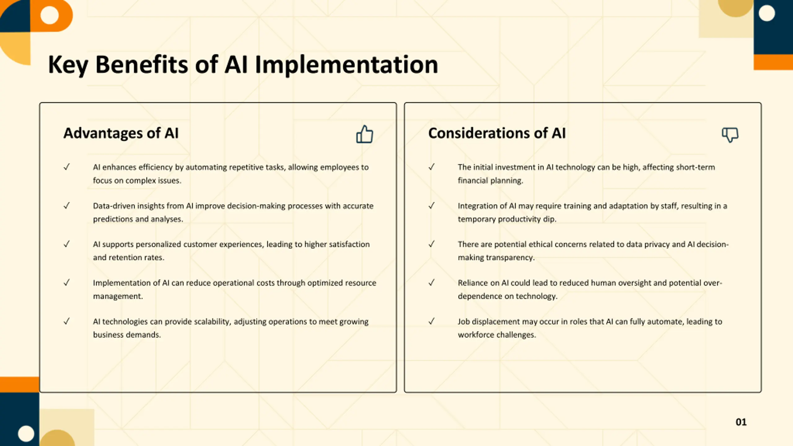 Key Benefits of AI Implementation Advantages of AI Considerations of AI AI enhances efficiency by automating repetitive tasks, allowing employees to focus on complex issues. The initial investment in AI technology can be high, affecting short-term financial planning. Data-driven insights from AI improve decision-making processes with accurate predictions and analyses. Integration of AI may require training and adaptation by staff, resulting in a temporary productivity dip. AI supports personalized customer experiences, leading to higher satisfaction and retention rates. There are potential ethical concerns related to data privacy and AI decision- making transparency. Implementation of AI can reduce operational costs through optimized resource management. Reliance on AI could lead to reduced human oversight and potential over- dependence on technology. AI technologies can provide scalability, adjusting operations to meet growing business demands. Job displacement may occur in roles that AI can fully automate, leading to workforce challenges. 01