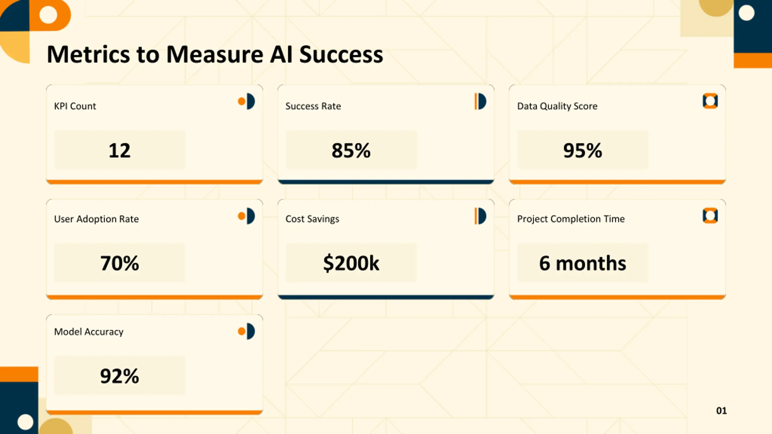 Metrics to Measure AI Success KPI Count Success Rate Data Quality Score 12 85% 95% Cost Savings Project Completion Time User Adoption Rate 70% $200k 6 months Model Accuracy 92% 01