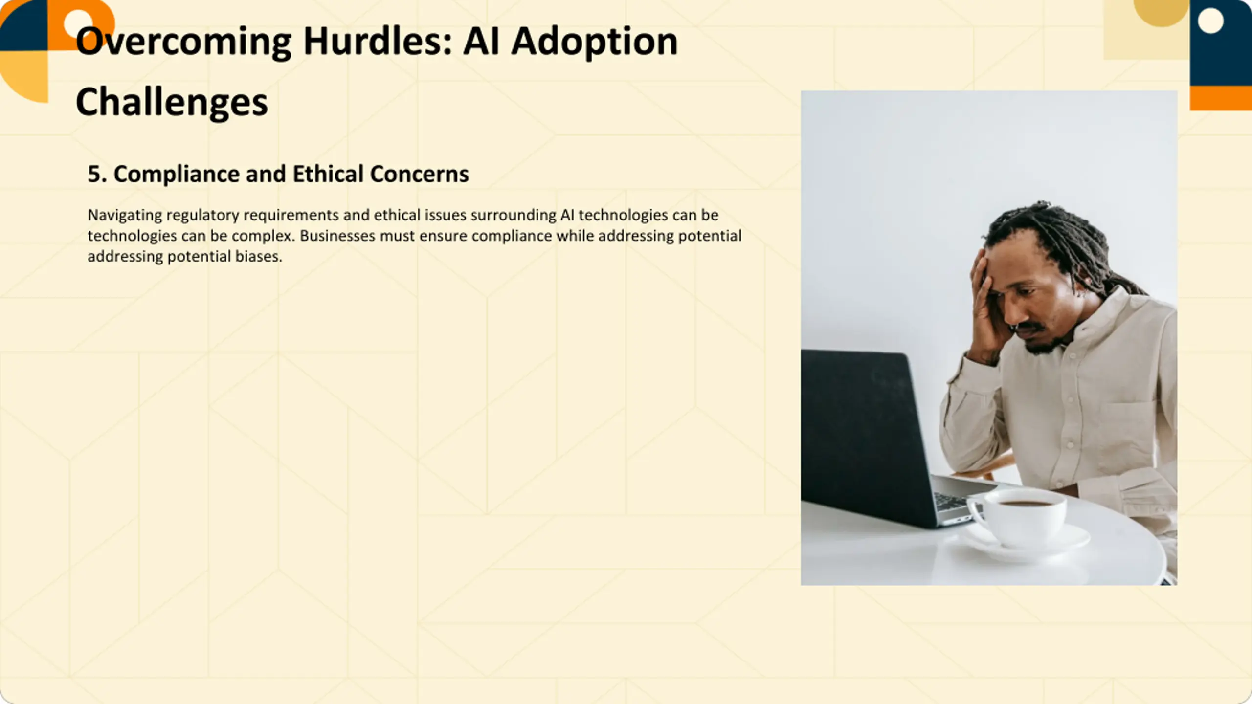 Overcoming Hurdles: AI Adoption Challenges 5. Compliance and Ethical Concerns Navigating regulatory requirements and ethical issues surrounding AI technologies can be technologies can be complex. Businesses must ensure compliance while addressing potential addressing potential biases.