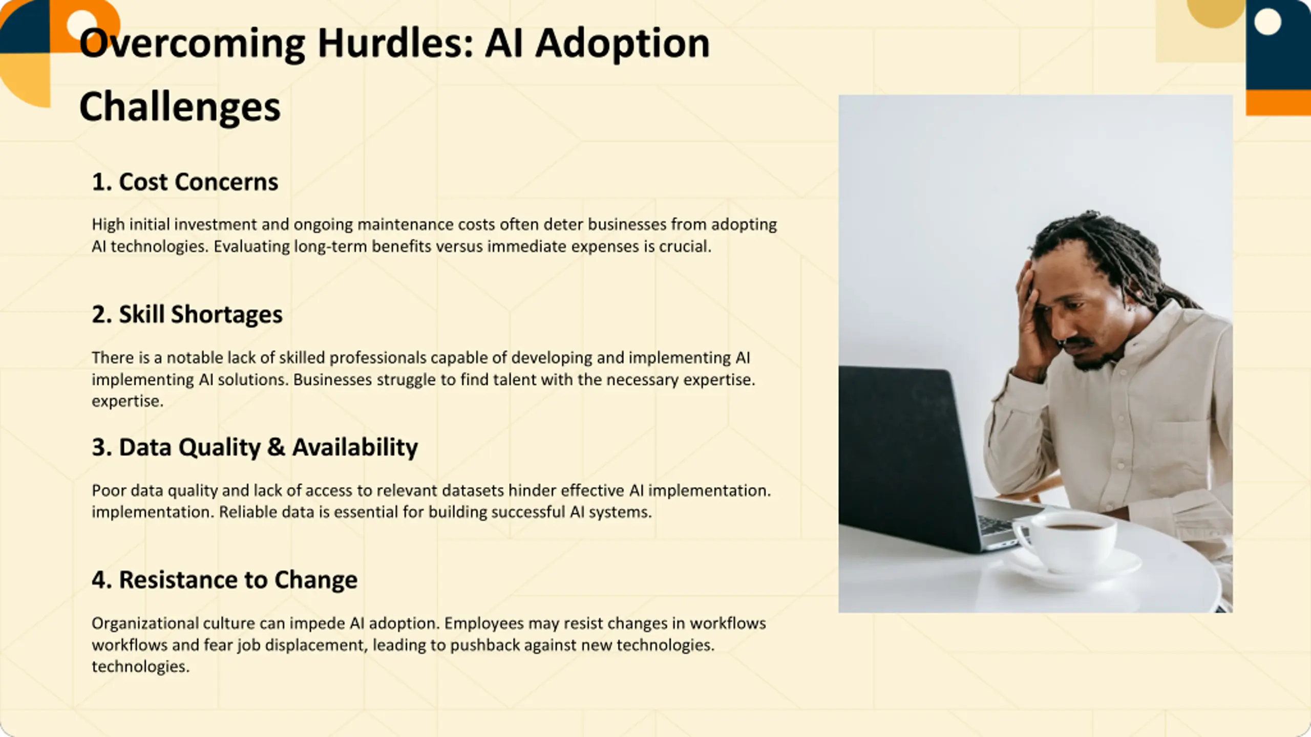 Overcoming Hurdles: AI Adoption Challenges 1. Cost Concerns High initial investment and ongoing maintenance costs often deter businesses from adopting AI technologies. Evaluating long-term benefits versus immediate expenses is crucial. 2. Skill Shortages There is a notable lack of skilled professionals capable of developing and implementing AI implementing AI solutions. Businesses struggle to find talent with the necessary expertise. expertise. 3. Data Quality & Availability Poor data quality and lack of access to relevant datasets hinder effective AI implementation. implementation. Reliable data is essential for building successful AI systems. 4. Resistance to Change Organizational culture can impede AI adoption. Employees may resist changes in workflows workflows and fear job displacement, leading to pushback against new technologies. technologies.