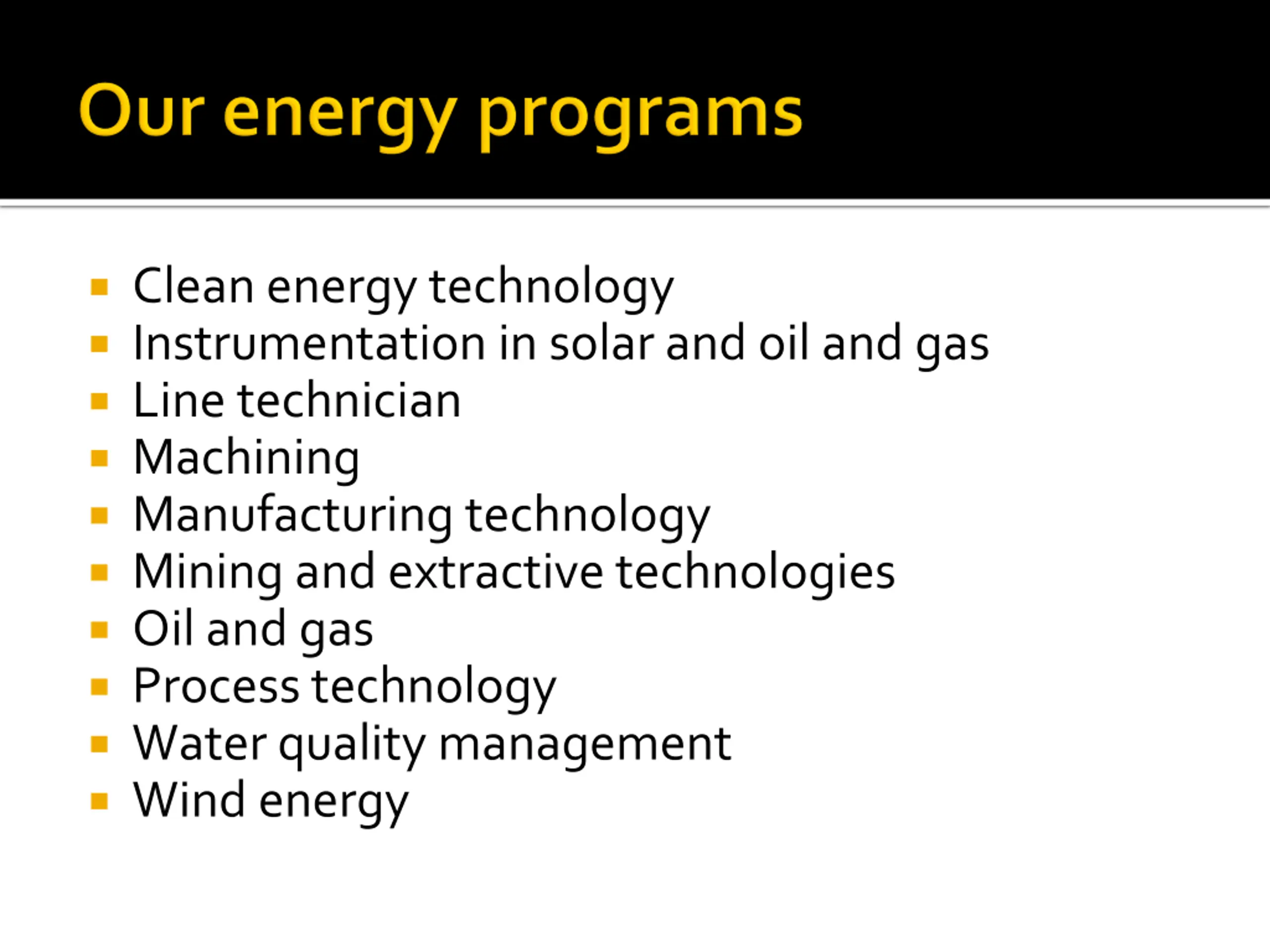 Clean energy technology Instrumentation in solar and oil and gas Line technician Machining Manufacturing technology Mining and extractive technologies Oil and gas Process technology Water quality management Wind energy