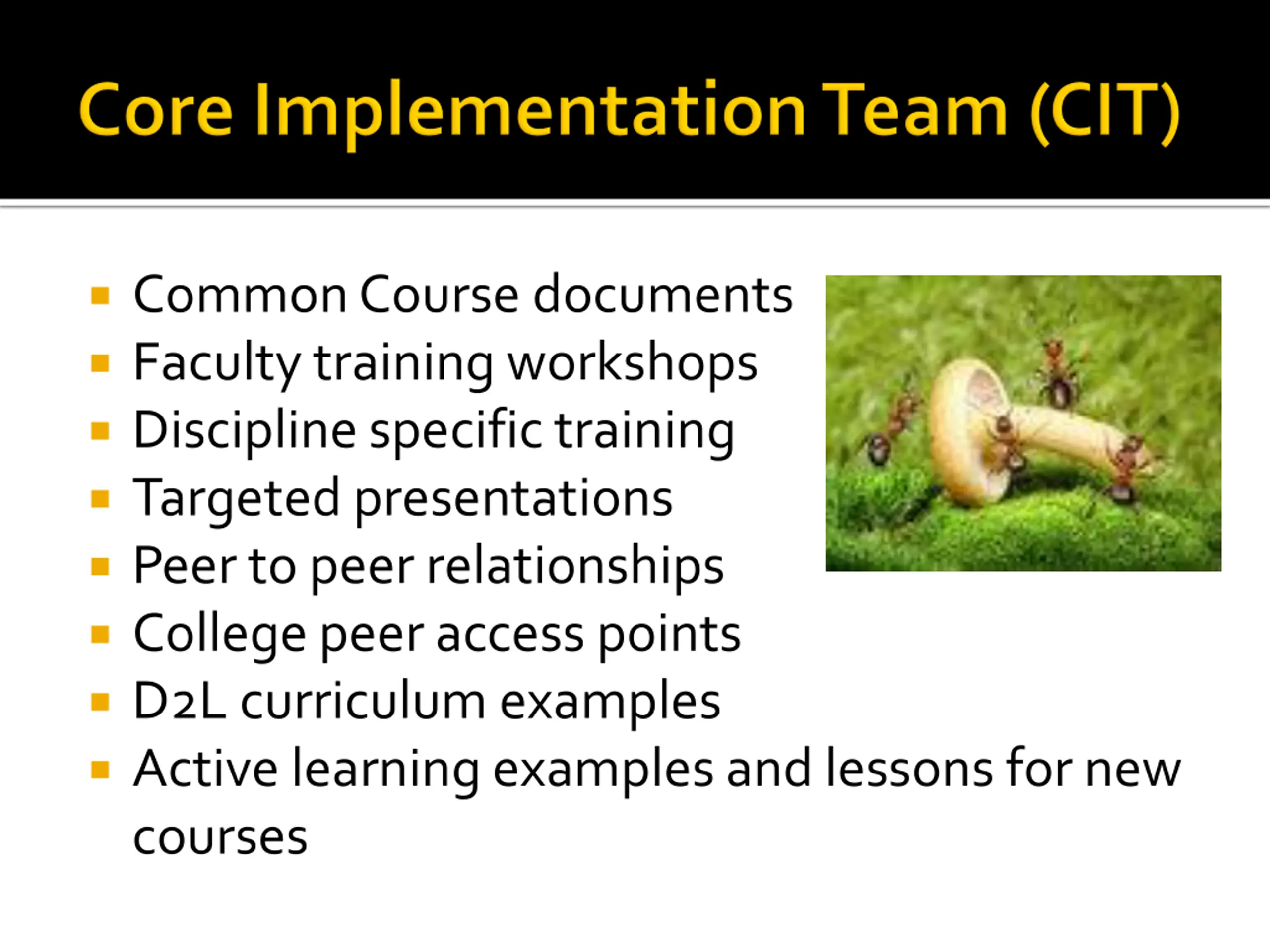 Common Course documents Faculty training workshops Discipline specific training Targeted presentations Peer to peer relationships College peer access points D2L curriculum examples Active learning examples and lessons for new courses