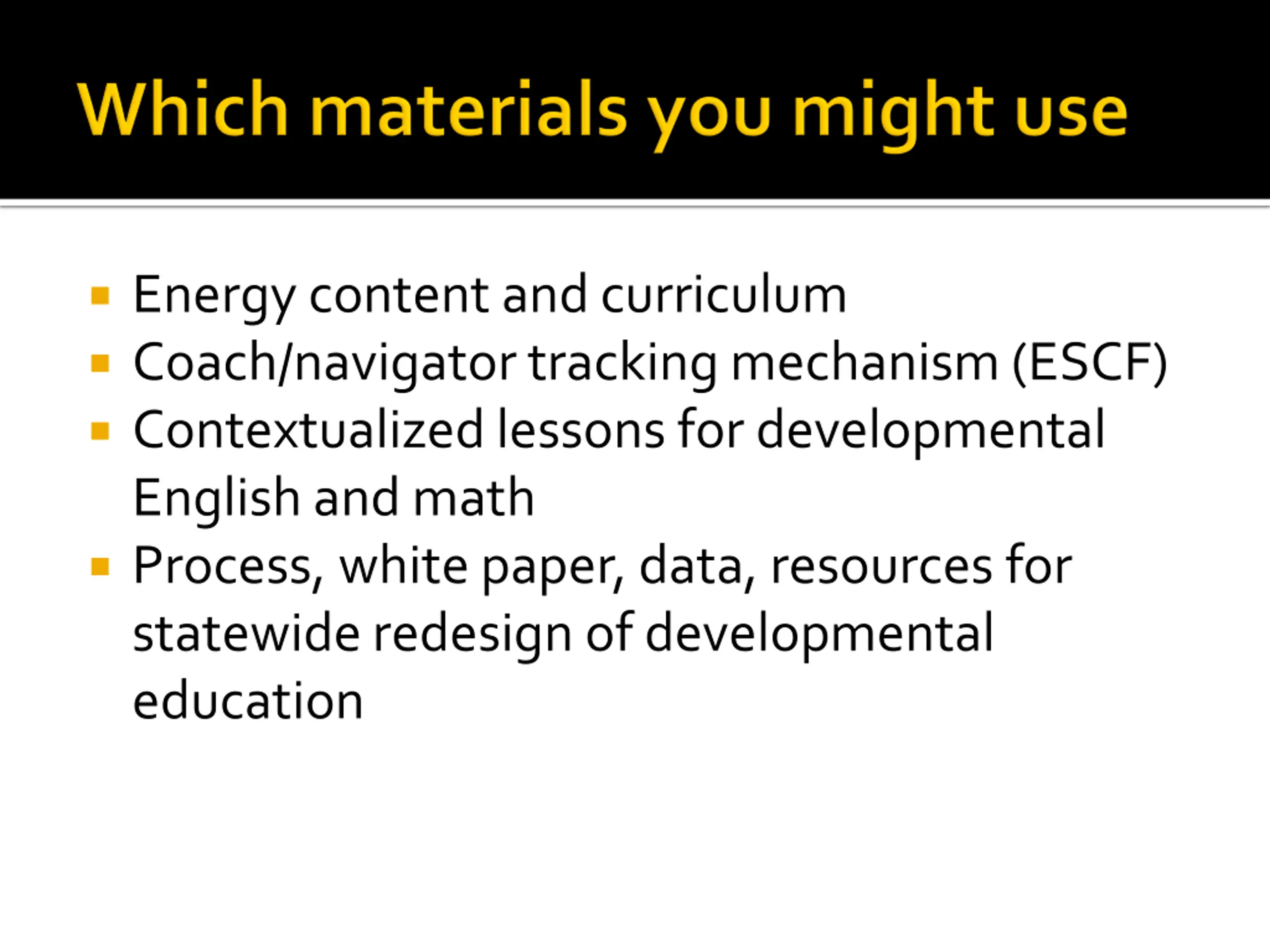 Energy content and curriculum Coach/navigator tracking mechanism (ESCF) Contextualized lessons for developmental English and math Process, white paper, data, resources for statewide redesign of developmental education