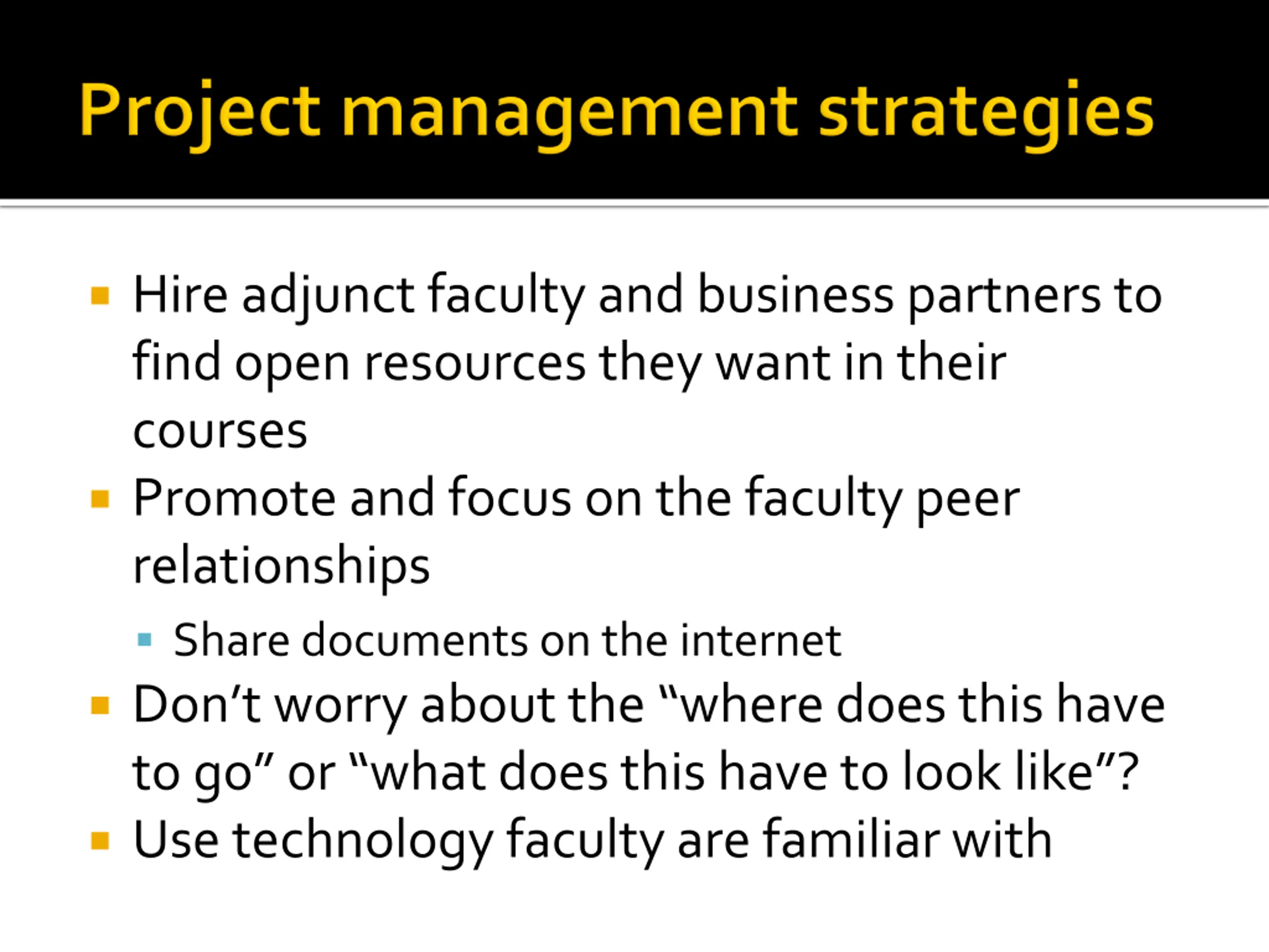 Hire adjunct faculty and business partners to find open resources they want in their courses Promote and focus on the faculty peer relationships Share documents on the internet Don t worry about the where does this have to go or what does this have to look like ? Use technology faculty are familiar with