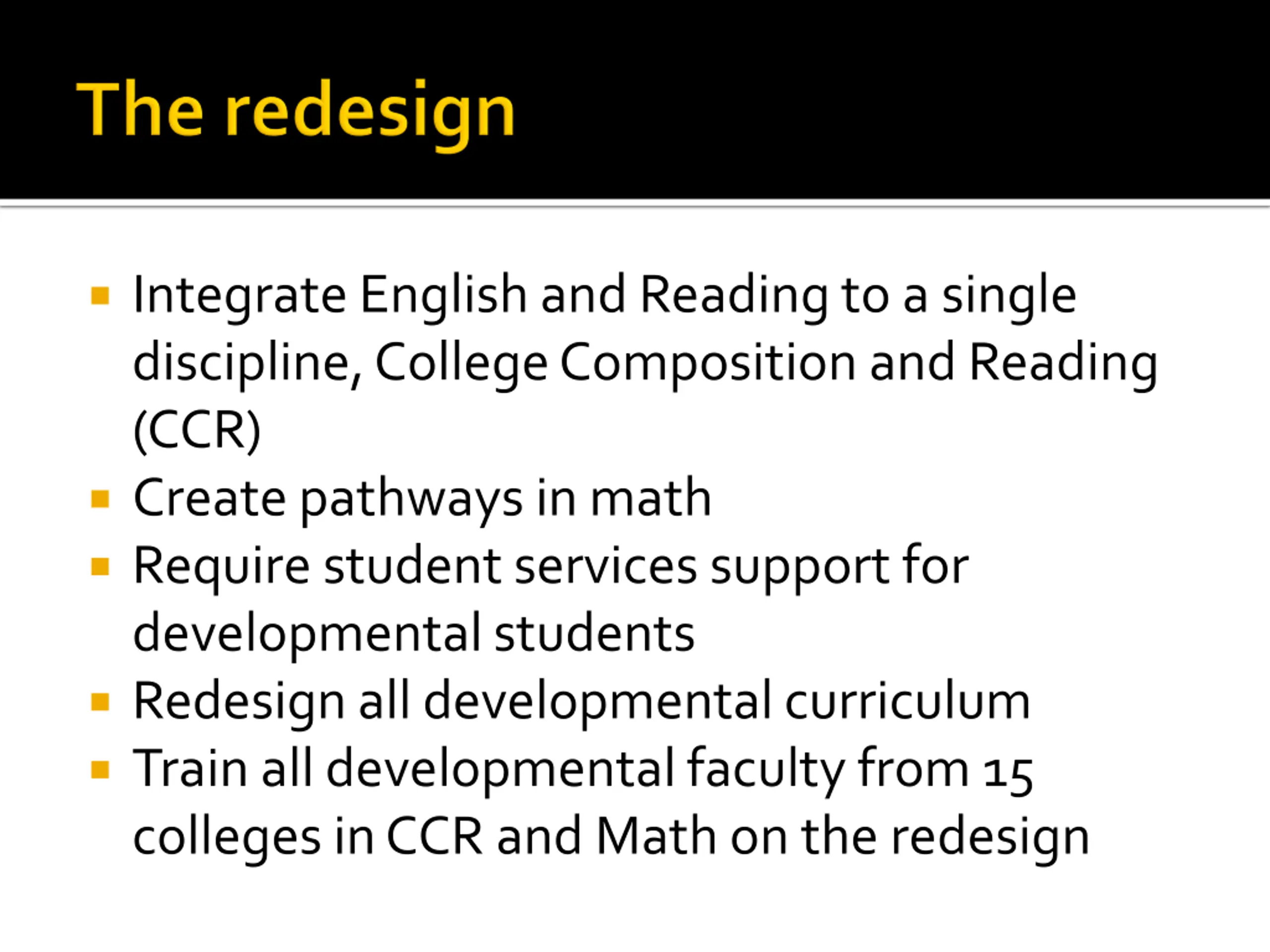 Integrate English and Reading to a single discipline, College Composition and Reading (CCR) Create pathways in math Require student services support for developmental students Redesign all developmental curriculum Train all developmental faculty from 15 colleges in CCR and Math on the redesign