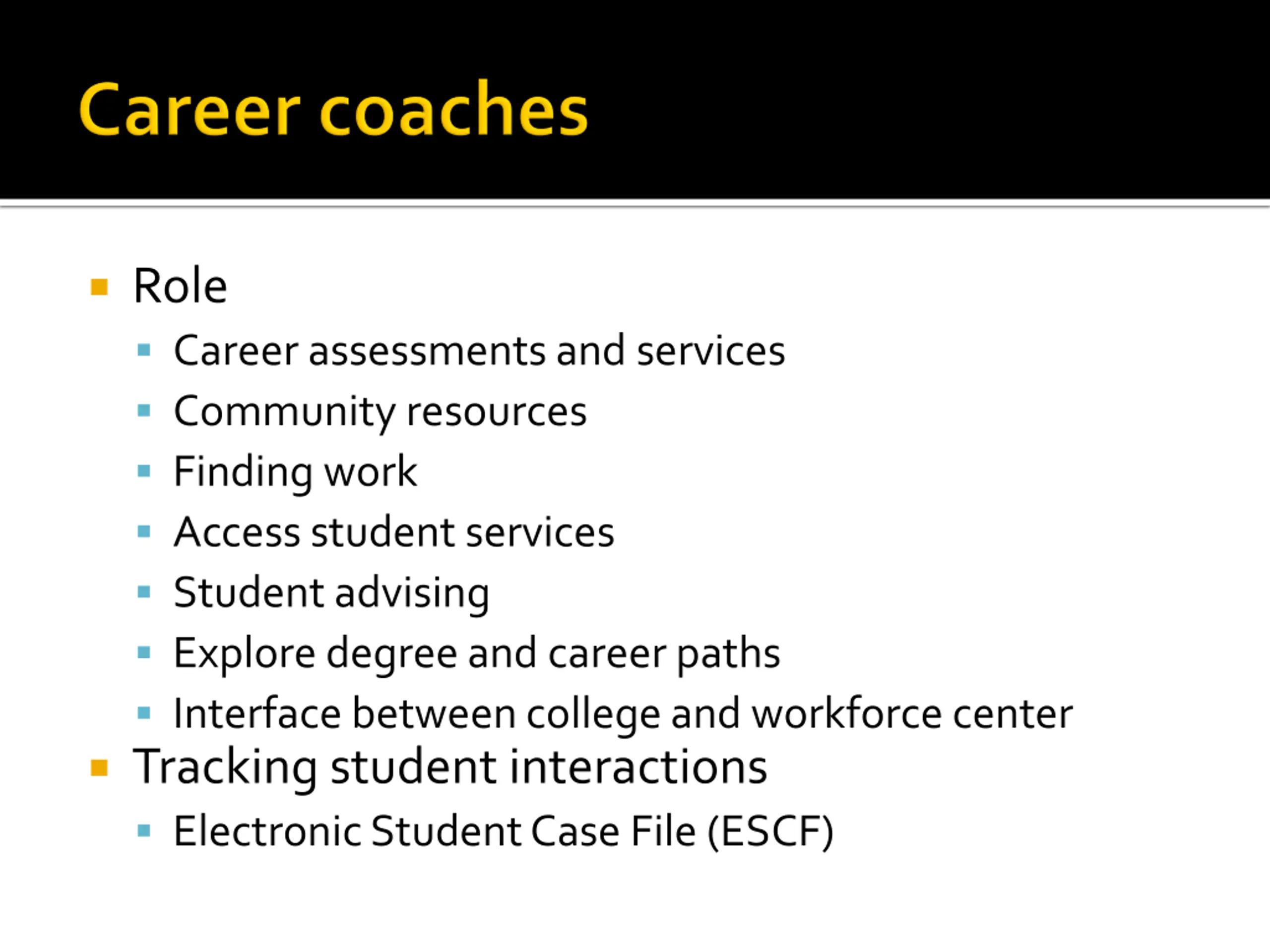 Role Career assessments and services Community resources Finding work Access student services Student advising Explore degree and career paths Interface between college and workforce center Tracking student interactions Electronic Student Case File (ESCF)