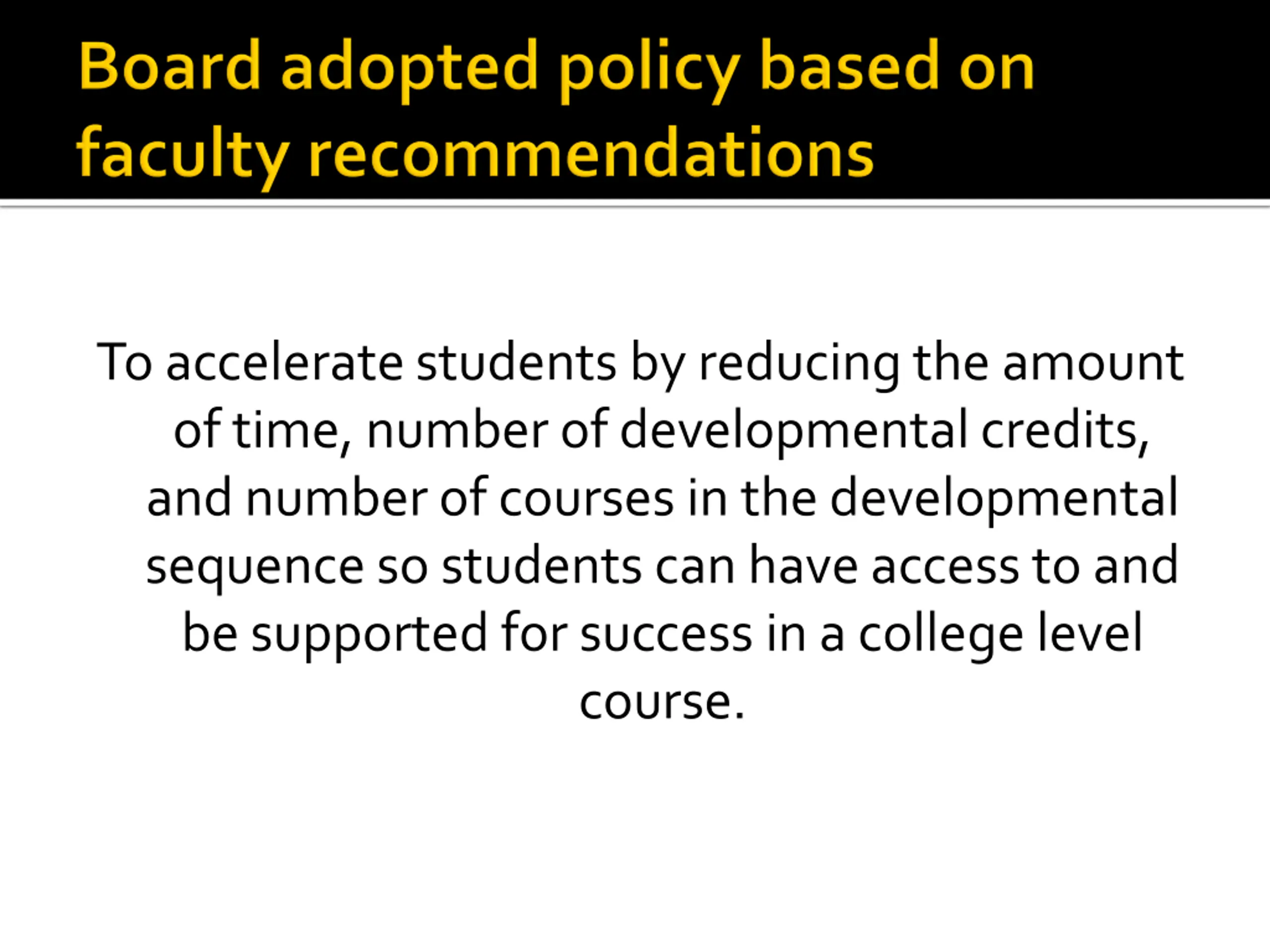 To accelerate students by reducing the amount of time, number of developmental credits, and number of courses in the developmental sequence so students can have access to and be supported for success in a college level course.