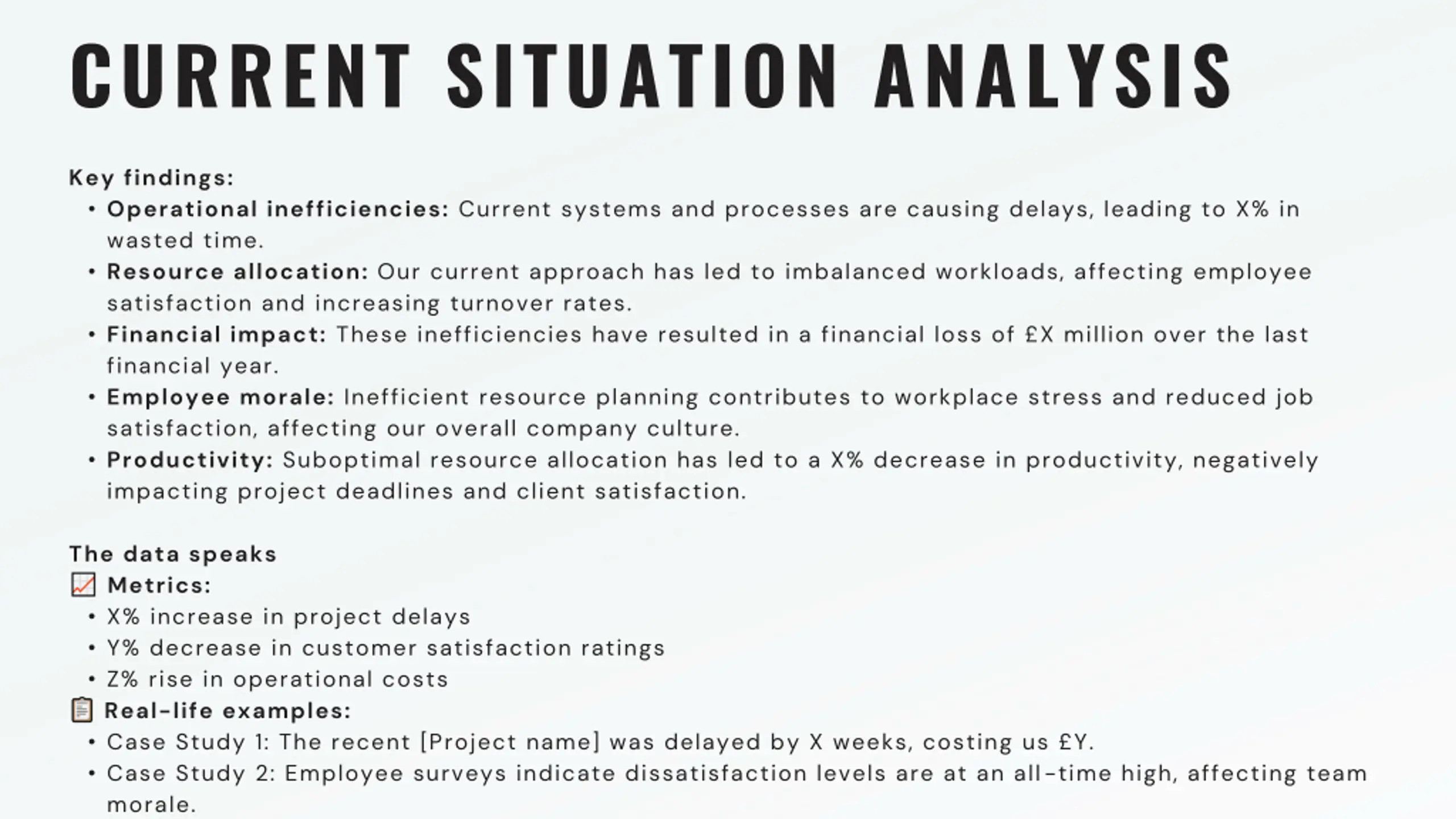 CURRENT SITUATION ANALYSIS Key findings: Operational inefficiencies: Current systems and processes are causing delays, leading to X% in wasted time. Resource allocation: Our current approach has led to imbalanced workloads, affecting employee satisfaction and increasing turnover rates. Financial impact: These inefficiencies have resulted in a financial loss of X million over the last financial year. Employee morale: Inefficient resource planning contributes to workplace stress and reduced job satisfaction, affecting our overall company culture. Productivity: Suboptimal resource allocation has led to a X% decrease in productivity, negatively impacting project deadlines and client satisfaction. The data speaks Metrics: X% increase in project delays Y% decrease in customer satisfaction ratings Z% rise in operational costs Real-life examples: Case Study 1: The recent [Project name] was delayed by X weeks, costing us Y. Case Study 2: Employee surveys indicate dissatisfaction levels are at an all-time high, affecting team morale.