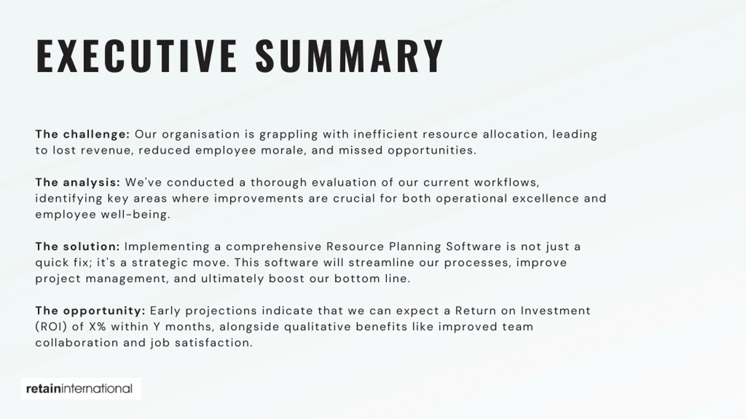 EXECUTIVE SUMMARY The challenge: Our organisation is grappling with inefficient resource allocation, leading to lost revenue, reduced employee morale, and missed opportunities. The analysis: We've conducted a thorough evaluation of our current workflows, identifying key areas where improvements are crucial for both operational excellence and employee well-being. The solution: Implementing a comprehensive Resource Planning Software is not just a quick fix; it's a strategic move. This software will streamline our processes, improve project management, and ultimately boost our bottom line. The opportunity: Early projections indicate that we can expect a Return on Investment (ROI) of X% within Y months, alongside qualitative benefits like improved team collaboration and job satisfaction.
