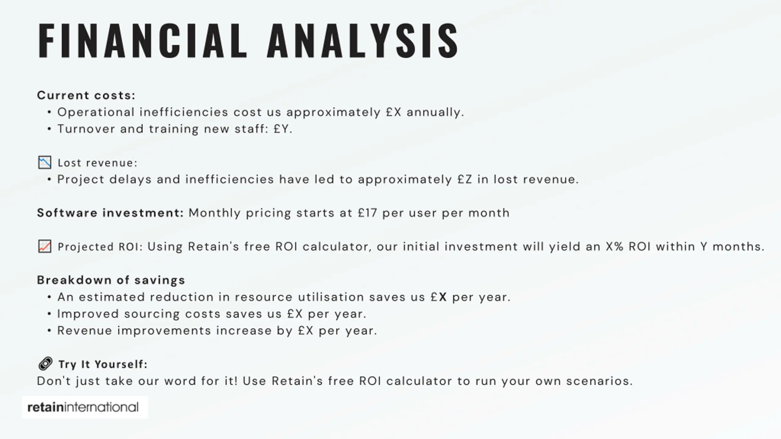 FINANCIAL ANALYSIS Current costs: Operational inefficiencies cost us approximately X annually. Turnover and training new staff: Y. Lost revenue: Project delays and inefficiencies have led to approximately Z in lost revenue. Software investment: Monthly pricing starts at 17 per user per month Projected ROI: Using Retain's free ROI calculator, our initial investment will yield an X% ROI within Y months. Breakdown of savings An estimated reduction in resource utilisation saves us X per year. Improved sourcing costs saves us X per year. Revenue improvements increase by X per year. Try It Yourself: Don't just take our word for it! Use Retain's free ROI calculator to run your own scenarios.