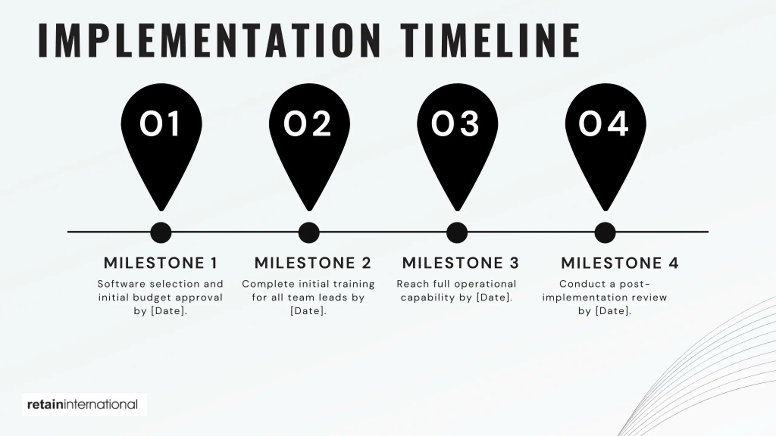 IMPLEMENTATION TIMELINE 01 02 03 04 MILESTONE 1 MILESTONE 2 MILESTONE 3 MILESTONE 4 Software selection and initial budget approval by [Date]. Complete initial training for all team leads by [Date]. Reach full operational capability by [Date]. Conduct a post- implementation review by [Date].