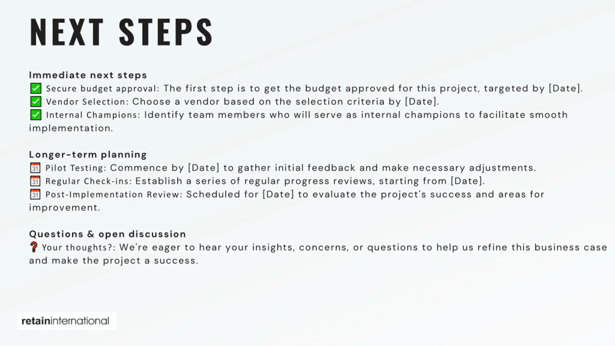 NEXT STEPS Immediate next steps Secure budget approval: The first step is to get the budget approved for this project, targeted by [Date]. Vendor Selection: Choose a vendor based on the selection criteria by [Date]. Internal Champions: Identify team members who will serve as internal champions to facilitate smooth implementation. Longer-term planning Pilot Testing: Commence by [Date] to gather initial feedback and make necessary adjustments. Regular Check-ins: Establish a series of regular progress reviews, starting from [Date]. Post-Implementation Review: Scheduled for [Date] to evaluate the project's success and areas for improvement. Questions & open discussion Your thoughts?: We're eager to hear your insights, concerns, or questions to help us refine this business case and make the project a success.