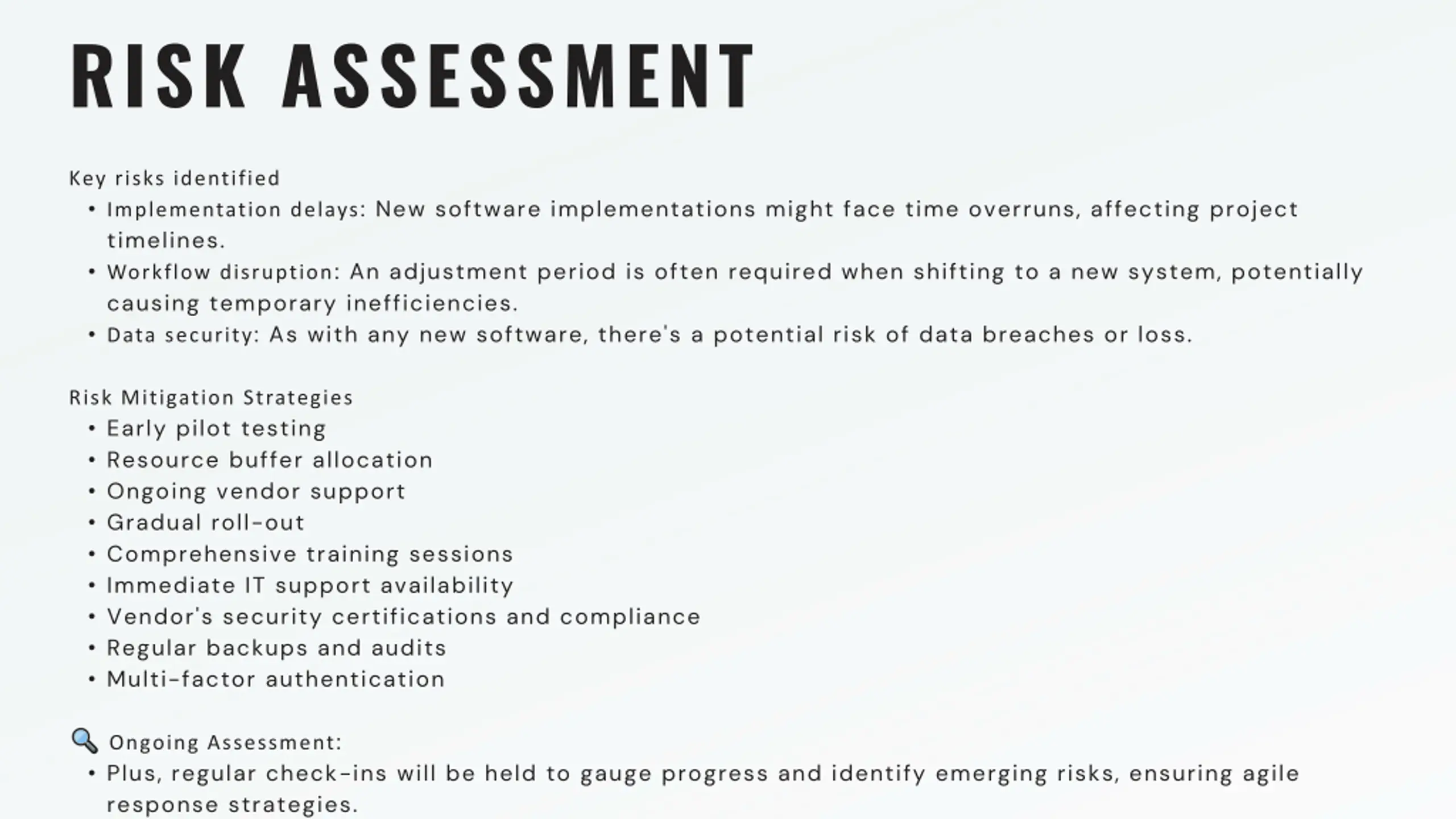 RISK ASSESSMENT Key risks identified Implementation delays: New software implementations might face time overruns, affecting project timelines. Workflow disruption: An adjustment period is often required when shifting to a new system, potentially causing temporary inefficiencies. Data security: As with any new software, there's a potential risk of data breaches or loss. Risk Mitigation Strategies Early pilot testing Resource buffer allocation Ongoing vendor support Gradual roll-out Comprehensive training sessions Immediate IT support availability Vendor's security certifications and compliance Regular backups and audits Multi-factor authentication Ongoing Assessment: Plus, regular check-ins will be held to gauge progress and identify emerging risks, ensuring agile response strategies.