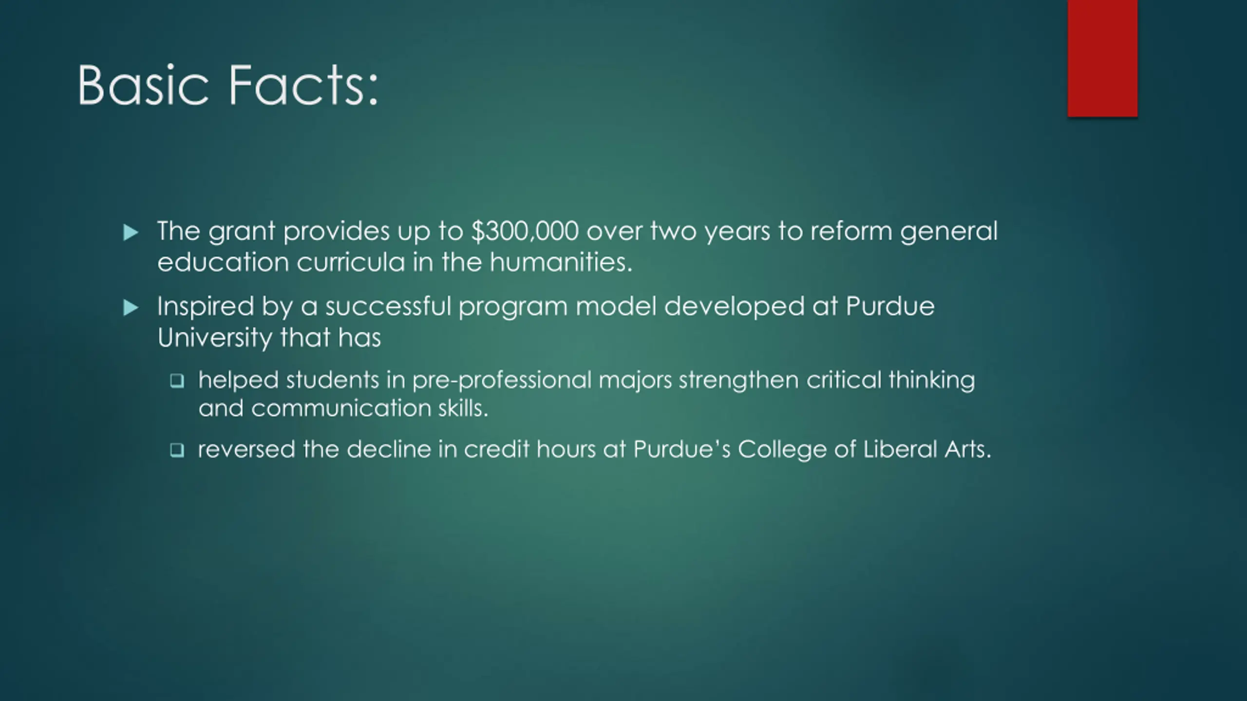 Basic Facts: The grant provides up to $300,000 over two years to reform general education curricula in the humanities. Inspired by a successful program model developed at Purdue University that has helped students in pre-professional majors strengthen critical thinking and communication skills. reversed the decline in credit hours at Purdue s College of Liberal Arts.