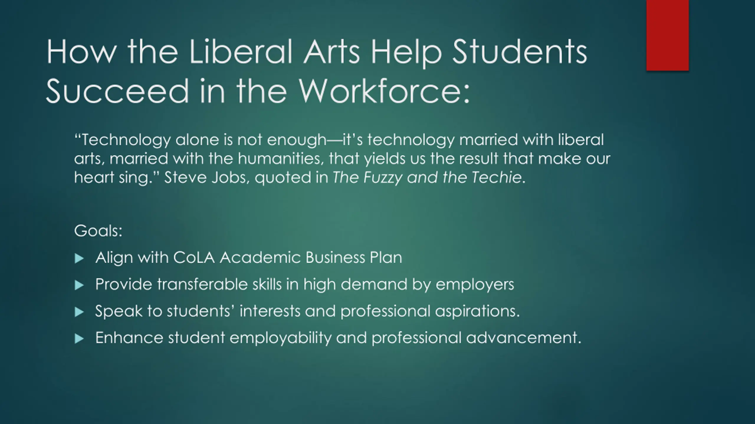 How the Liberal Arts Help Students Succeed in the Workforce: Technology alone is not enough it s technology married with liberal arts, married with the humanities, that yields us the result that make our heart sing. Steve Jobs, quoted in The Fuzzy and the Techie. Goals: Align with CoLA Academic Business Plan Provide transferable skills in high demand by employers Speak to students interests and professional aspirations. Enhance student employability and professional advancement.