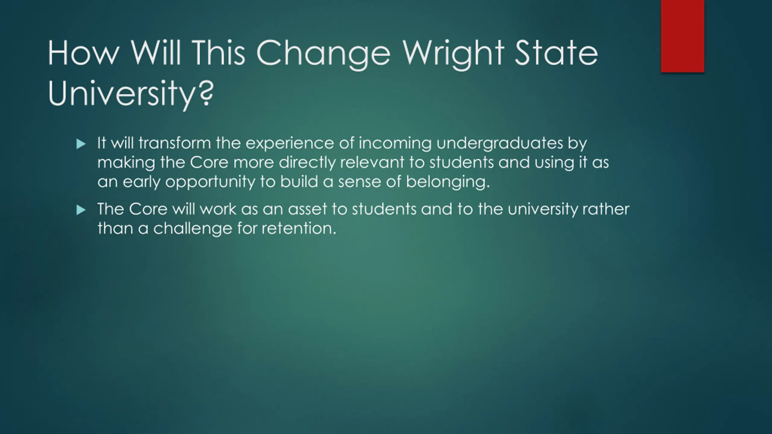 How Will This Change Wright State University? It will transform the experience of incoming undergraduates by making the Core more directly relevant to students and using it as an early opportunity to build a sense of belonging. The Core will work as an asset to students and to the university rather than a challenge for retention.