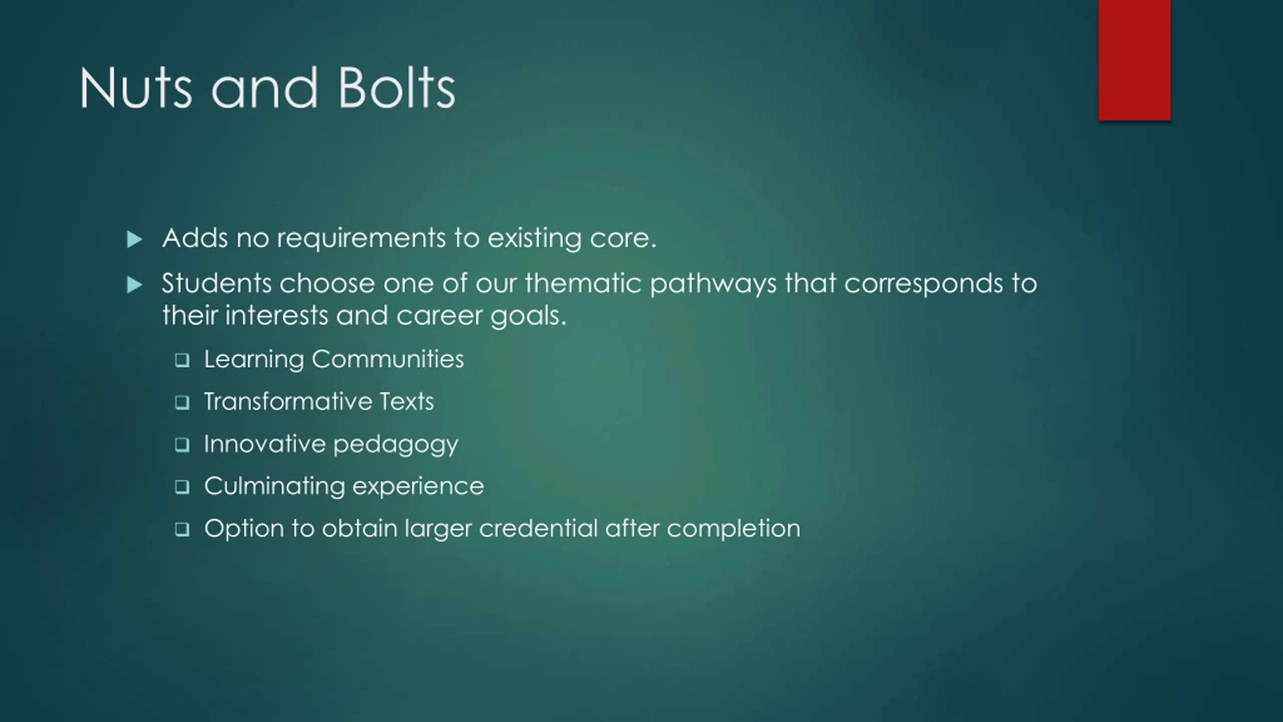Nuts and Bolts Adds no requirements to existing core. Students choose one of our thematic pathways that corresponds to their interests and career goals. Learning Communities Transformative Texts Innovative pedagogy Culminating experience Option to obtain larger credential after completion