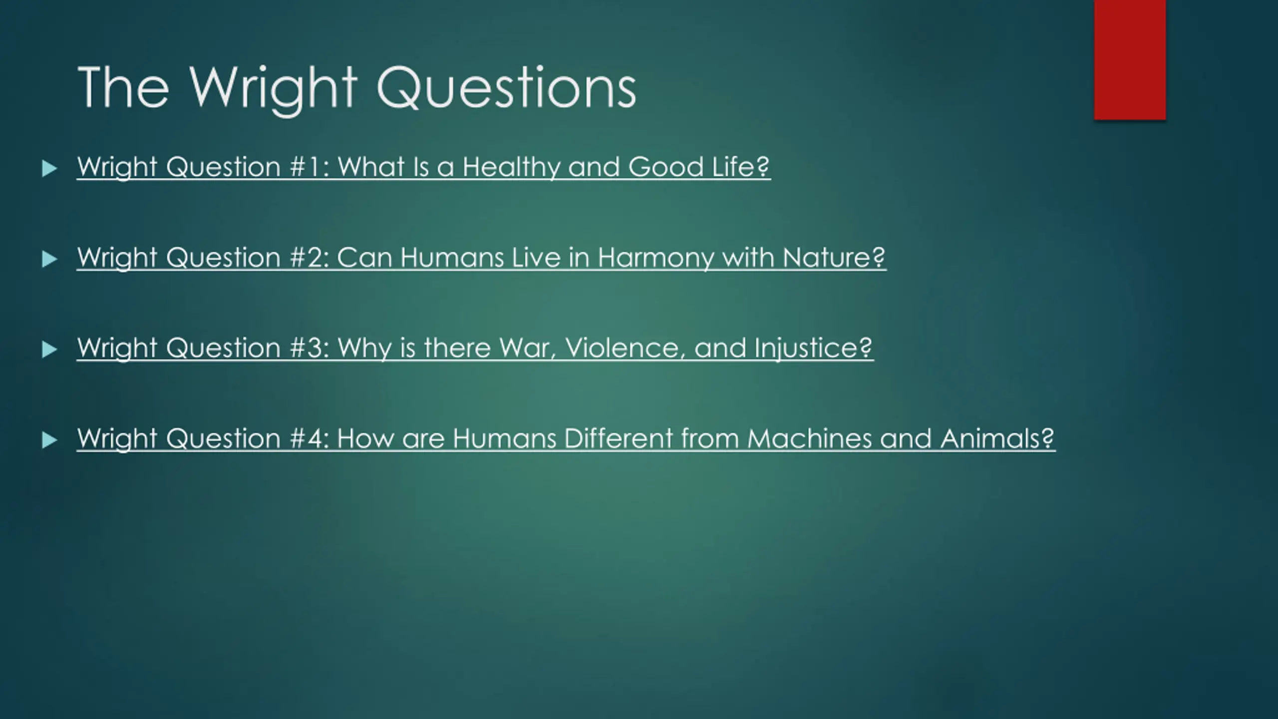 The Wright Questions Wright Question #1: What Is a Healthy and Good Life? Wright Question #2: Can Humans Live in Harmony with Nature? Wright Question #3: Why is there War, Violence, and Injustice? Wright Question #4: How are Humans Different from Machines and Animals?