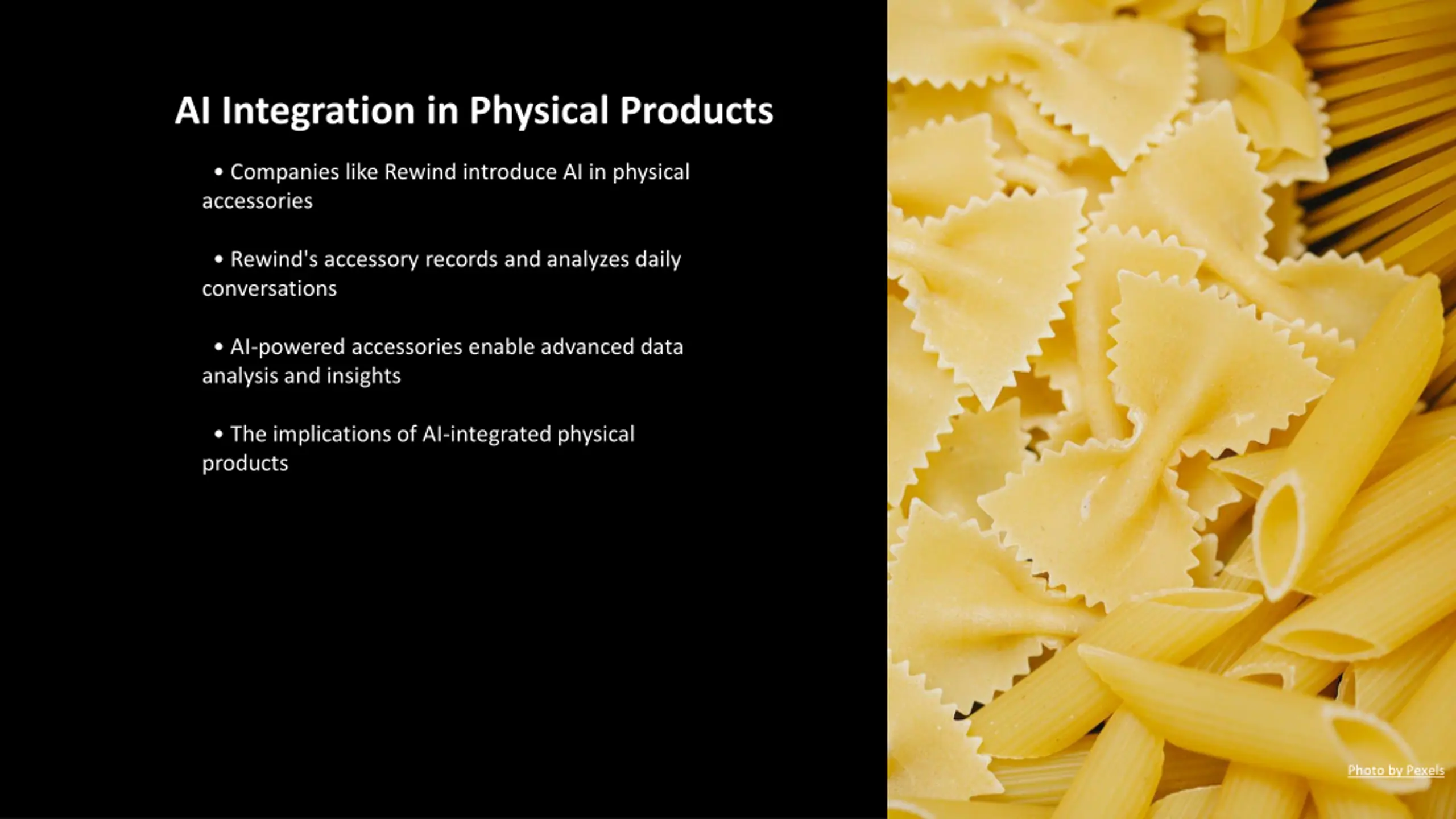 AI Integration in Physical Products Companies like Rewind introduce AI in physical accessories Rewind's accessory records and analyzes daily conversations AI-powered accessories enable advanced data analysis and insights The implications of AI-integrated physical products Photo by Pexels Photo by Pexels