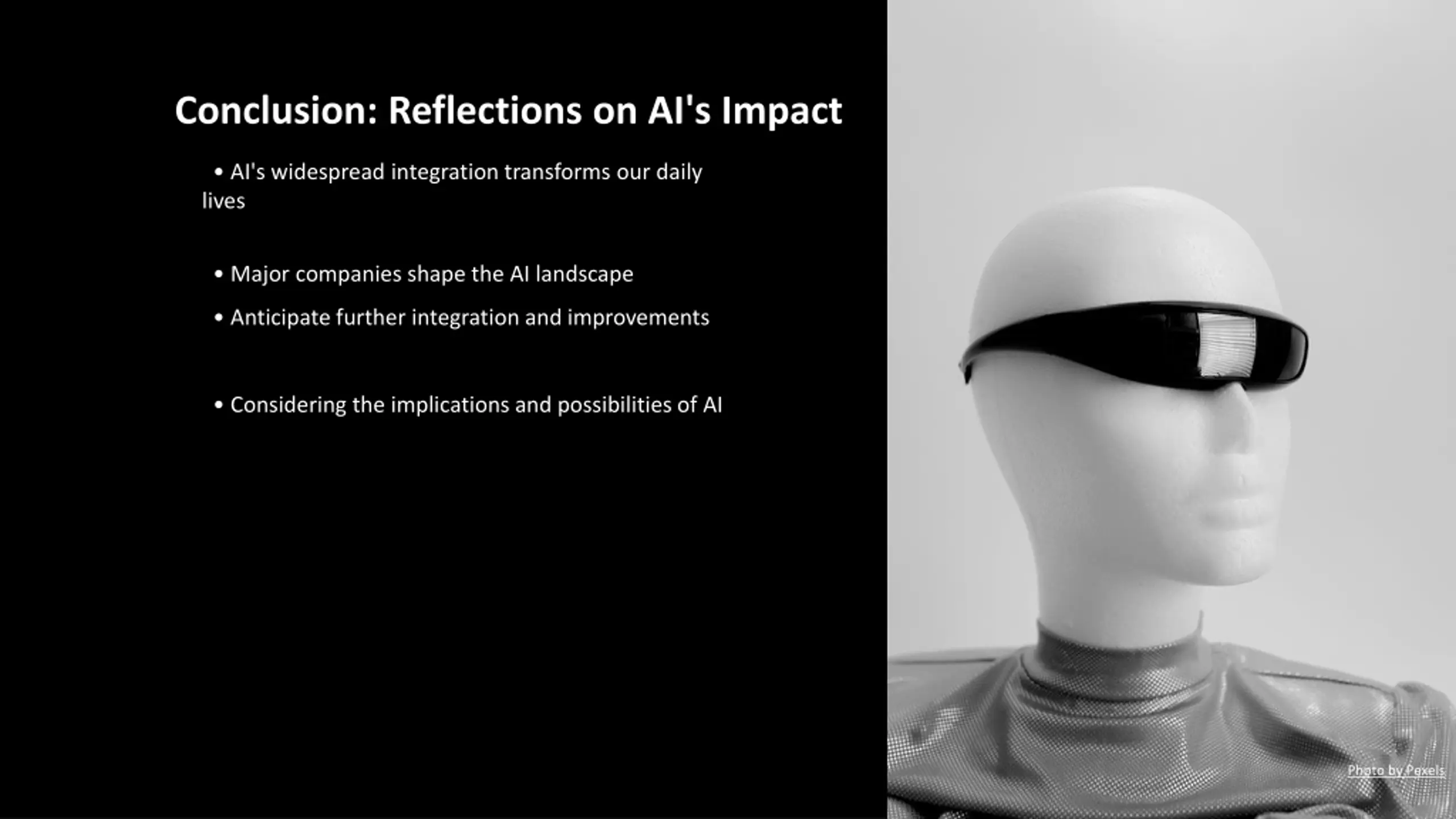 Conclusion: Reflections on AI's Impact AI's widespread integration transforms our daily lives Major companies shape the AI landscape Anticipate further integration and improvements Considering the implications and possibilities of AI Photo by Pexels Photo by Pexels