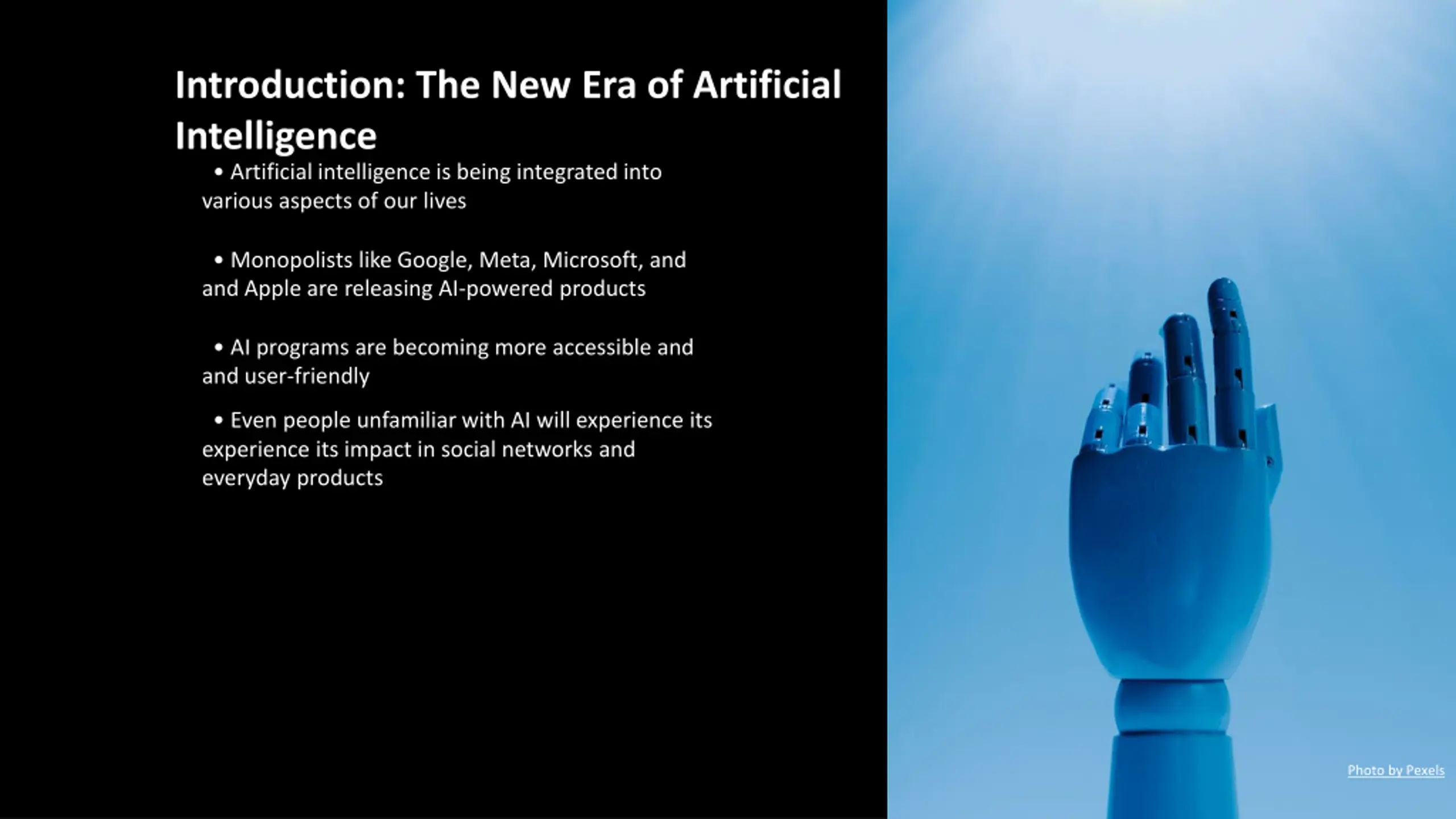 Introduction: The New Era of Artificial Intelligence Artificial intelligence is being integrated into various aspects of our lives Monopolists like Google, Meta, Microsoft, and and Apple are releasing AI-powered products AI programs are becoming more accessible and and user-friendly Even people unfamiliar with AI will experience its experience its impact in social networks and everyday products Photo by Pexels Photo by Pexels