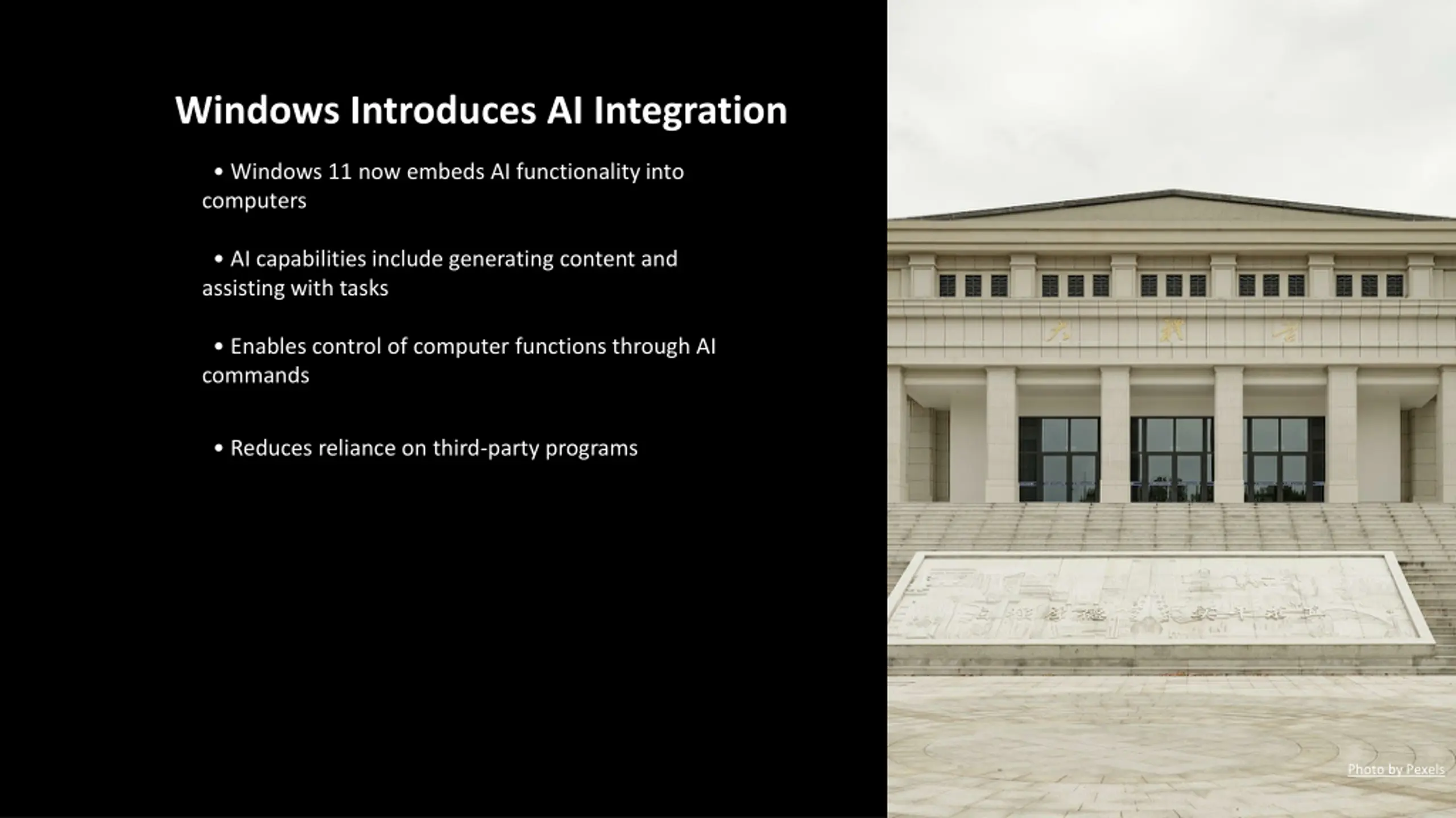 Windows Introduces AI Integration Windows 11 now embeds AI functionality into computers AI capabilities include generating content and assisting with tasks Enables control of computer functions through AI commands Reduces reliance on third-party programs Photo by Pexels Photo by Pexels