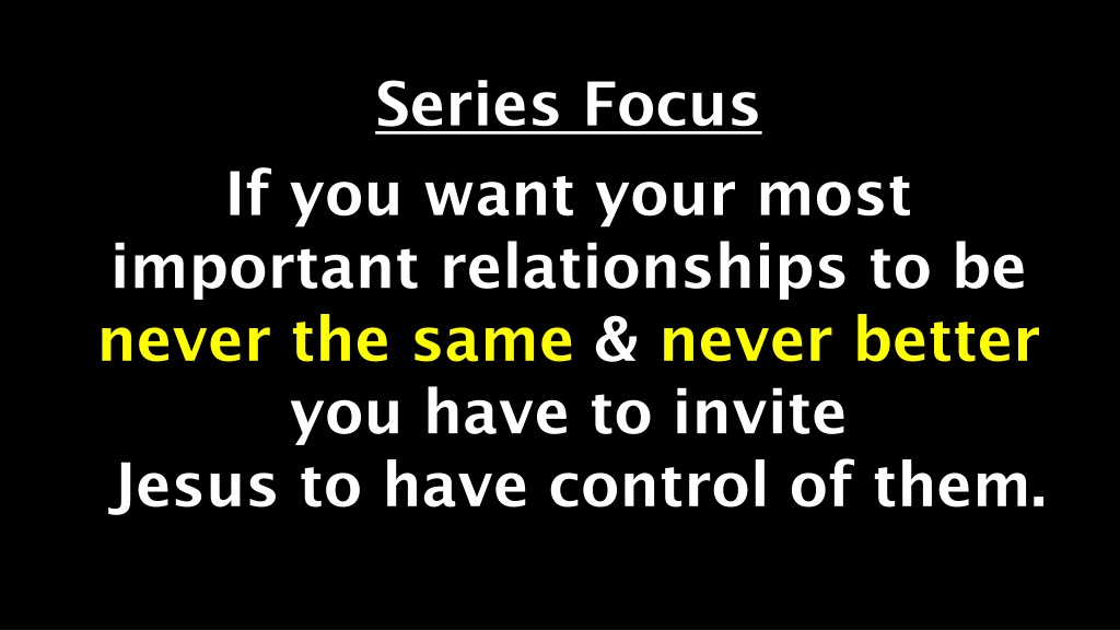 Series Focus If you want your most important relationships to be never the same & never better you have to invite Jesus to have control of them.