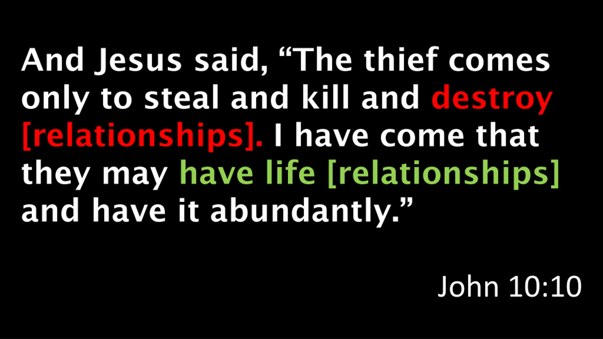 And Jesus said, The thief comes only to steal and kill and destroy [relationships]. I have come that they may have life [relationships] and have it abundantly. John 10:10