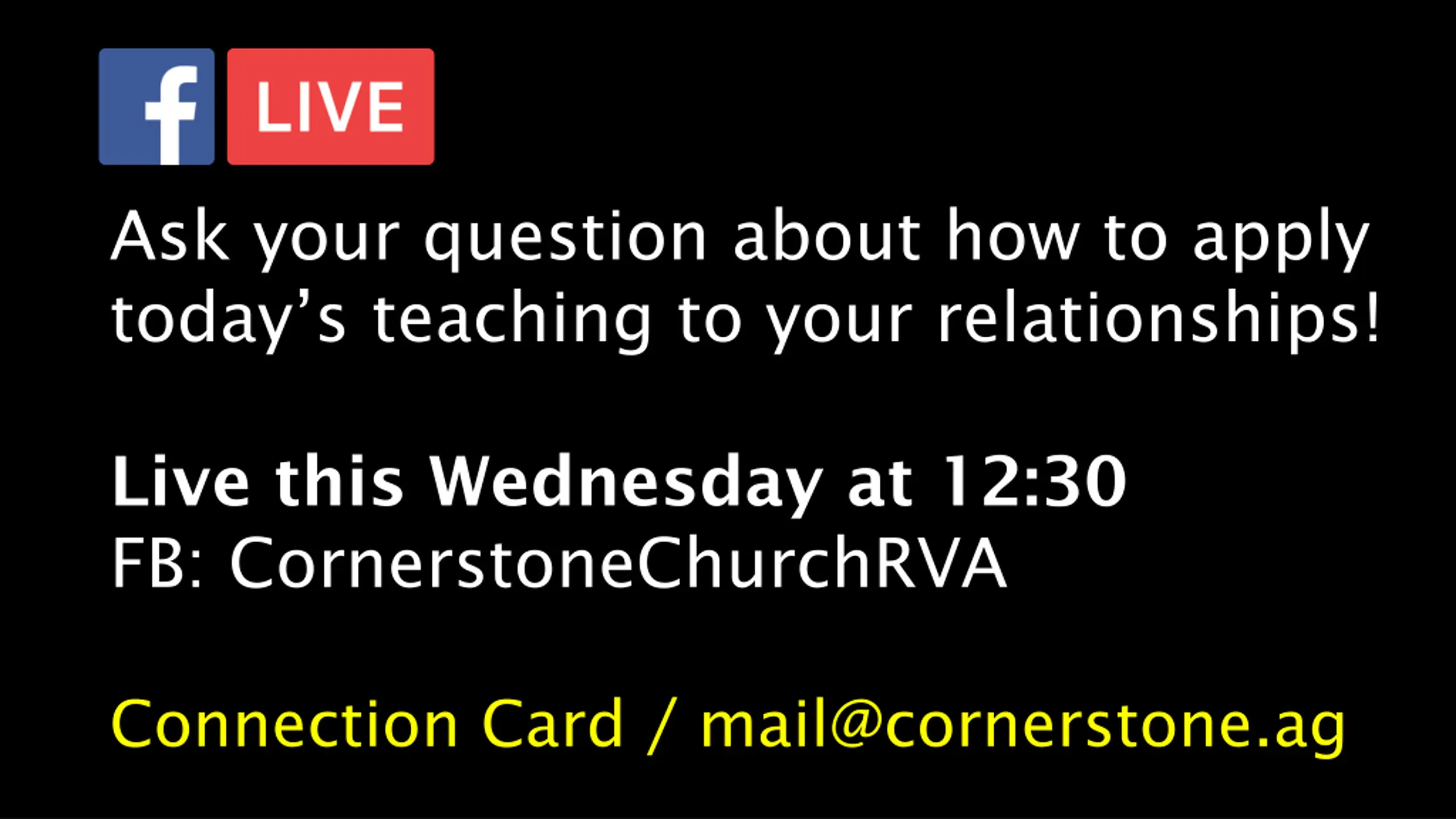 Ask your question about how to apply today s teaching to your relationships! Live this Wednesday at 12:30 FB: CornerstoneChurchRVA Connection Card / mail@cornerstone.ag