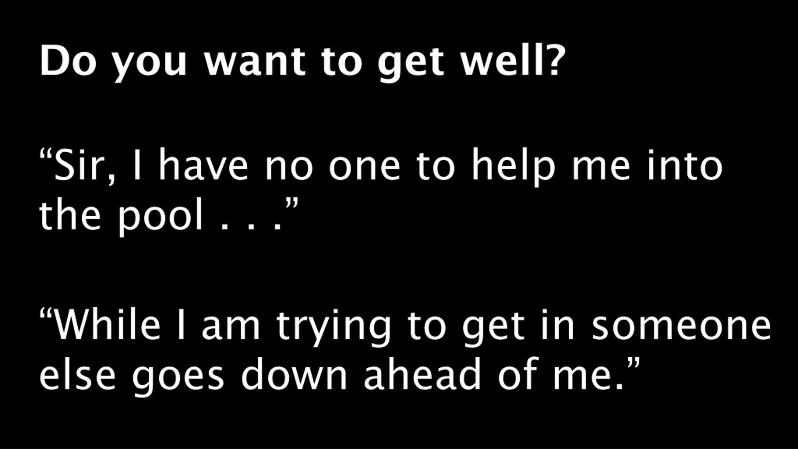 Do you want to get well? Sir, I have no one to help me into the pool . . . While I am trying to get in someone else goes down ahead of me.