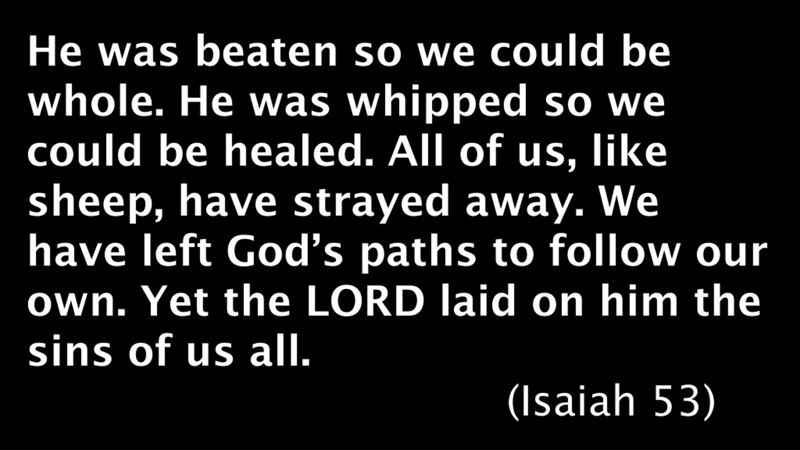 He was beaten so we could be whole. He was whipped so we could be healed. All of us, like sheep, have strayed away. We have left God s paths to follow our own. Yet the LORD laid on him the sins of us all. (Isaiah 53)