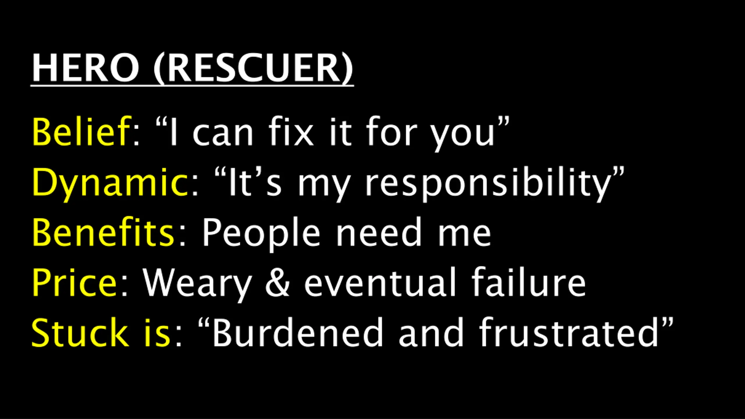 HERO (RESCUER) Belief: I can fix it for you Dynamic: It s my responsibility Benefits: People need me Price: Weary & eventual failure Stuck is: Burdened and frustrated
