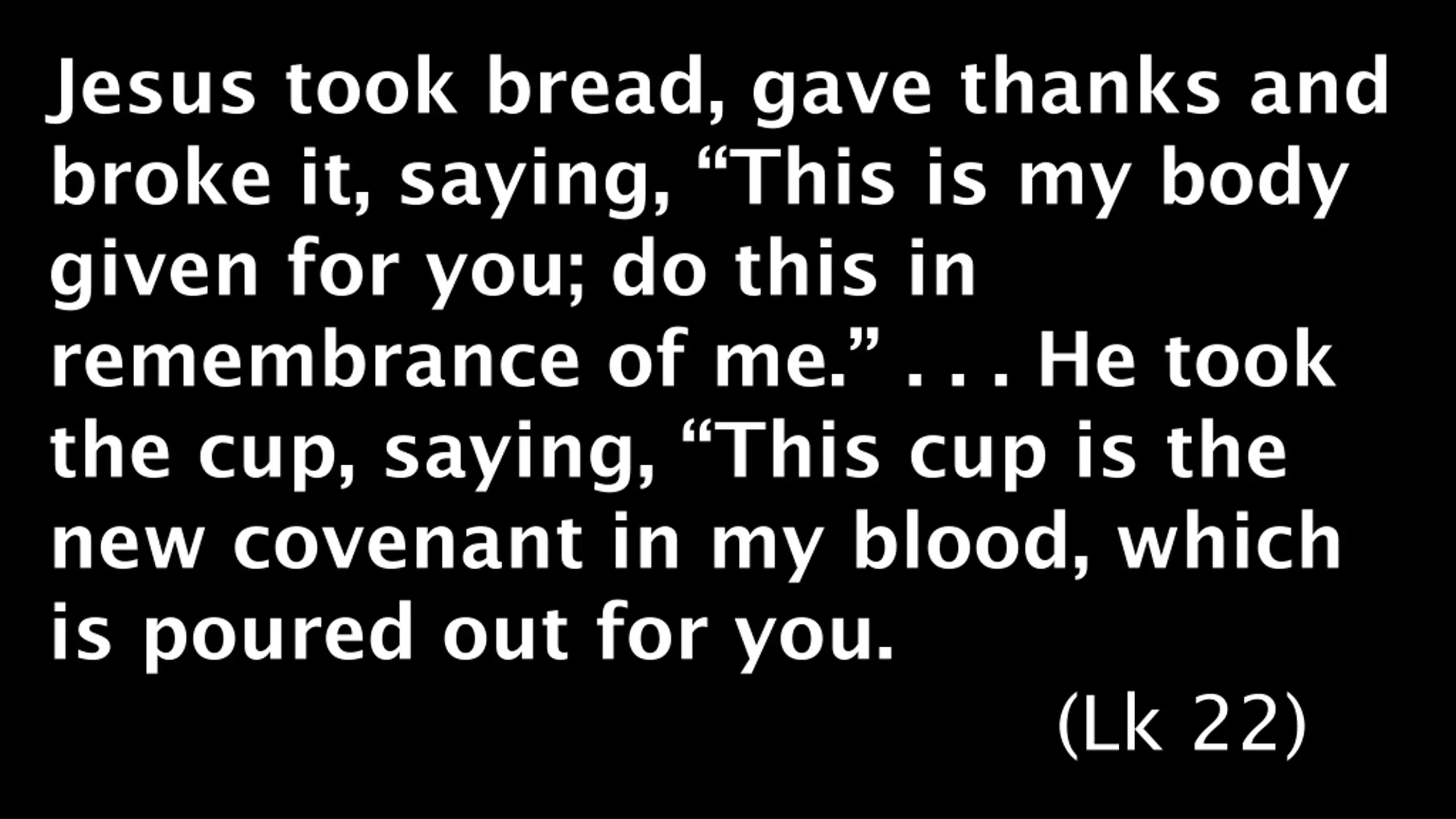 Jesus took bread, gave thanks and broke it, saying, This is my body given for you; do this in remembrance of me. . . . He took the cup, saying, This cup is the new covenant in my blood, which is poured out for you. (Lk 22)