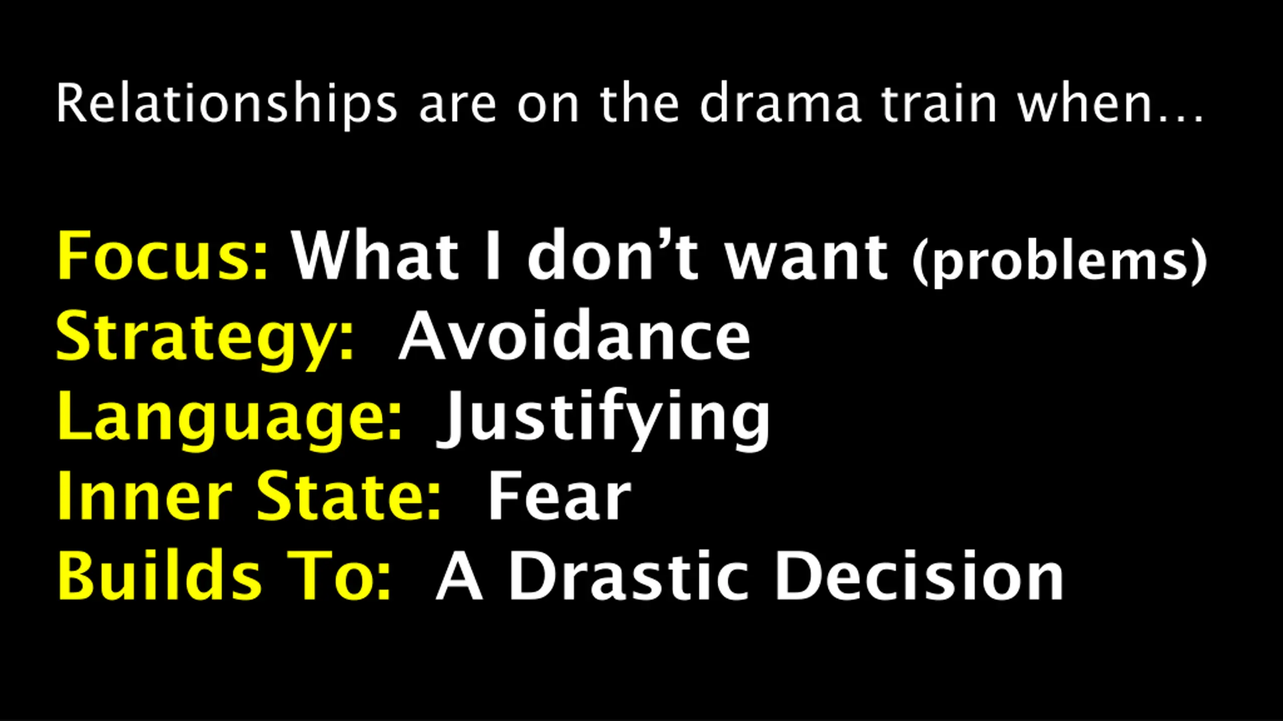 Relationships are on the drama train when Focus: What I don t want (problems) Strategy: Avoidance Language: Justifying Inner State: Fear Builds To: A Drastic Decision