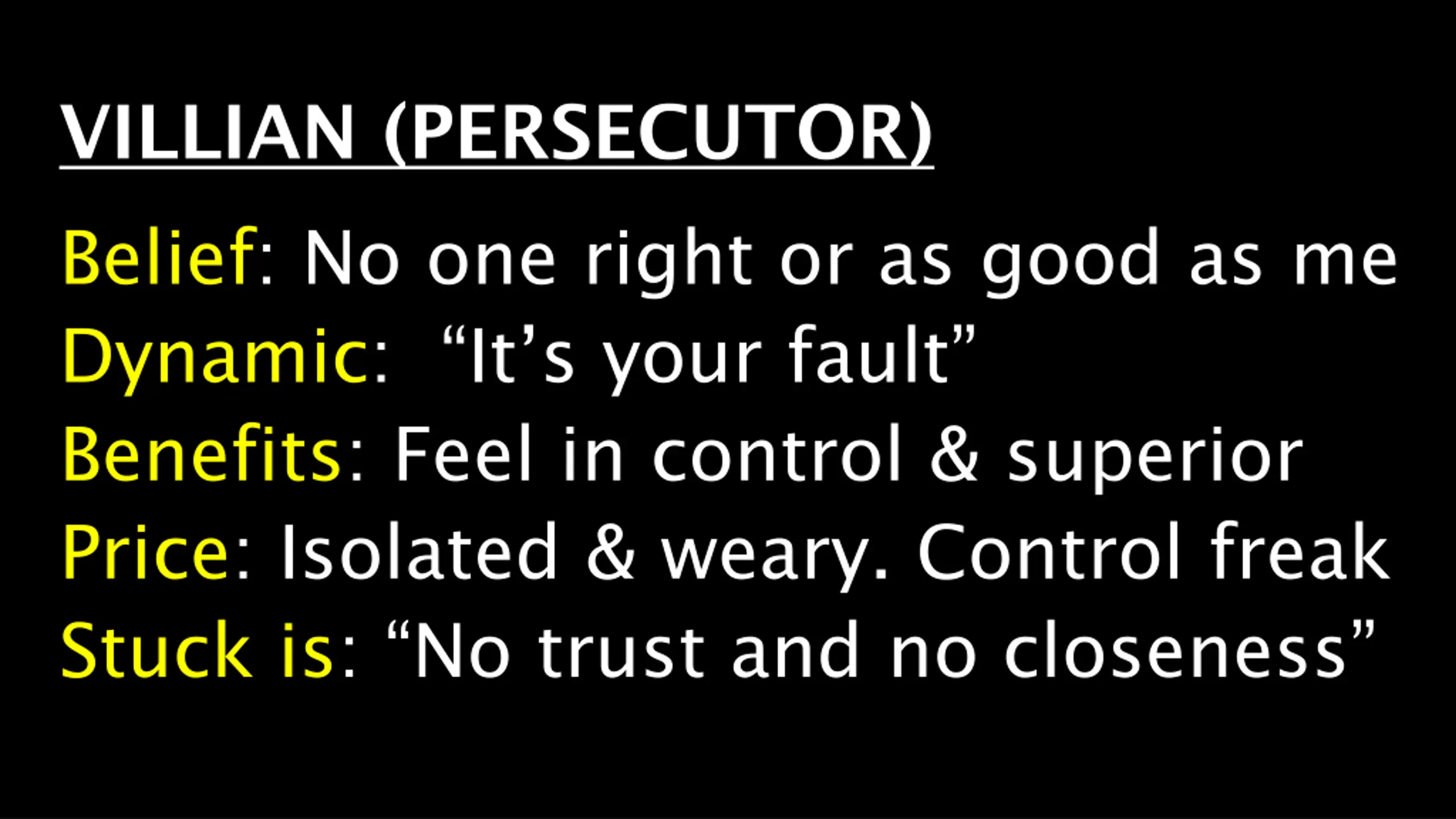 VILLIAN (PERSECUTOR) Belief: No one right or as good as me Dynamic: It s your fault Benefits: Feel in control & superior Price: Isolated & weary. Control freak Stuck is: No trust and no closeness