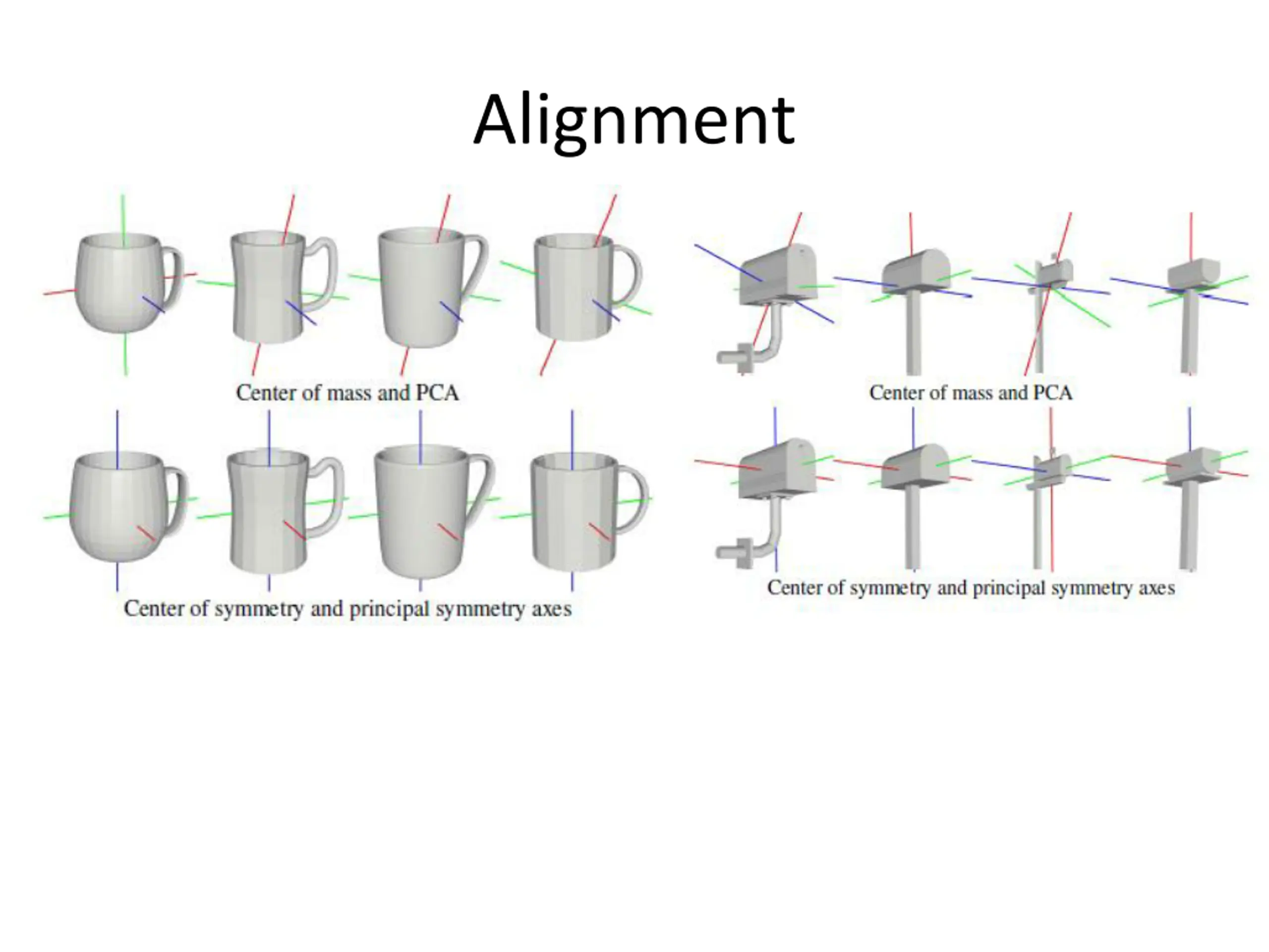 Segmentation Find significant maxima (planes ) of the PSRT (m maxima) For each point (or local face) compute the degree in which if contributes to symmetry of each plane Each point can be represented by an m-dim vector Cluster in this m-dimensional space <Use method of Katz and Tal, 2003> (anyone to present?)