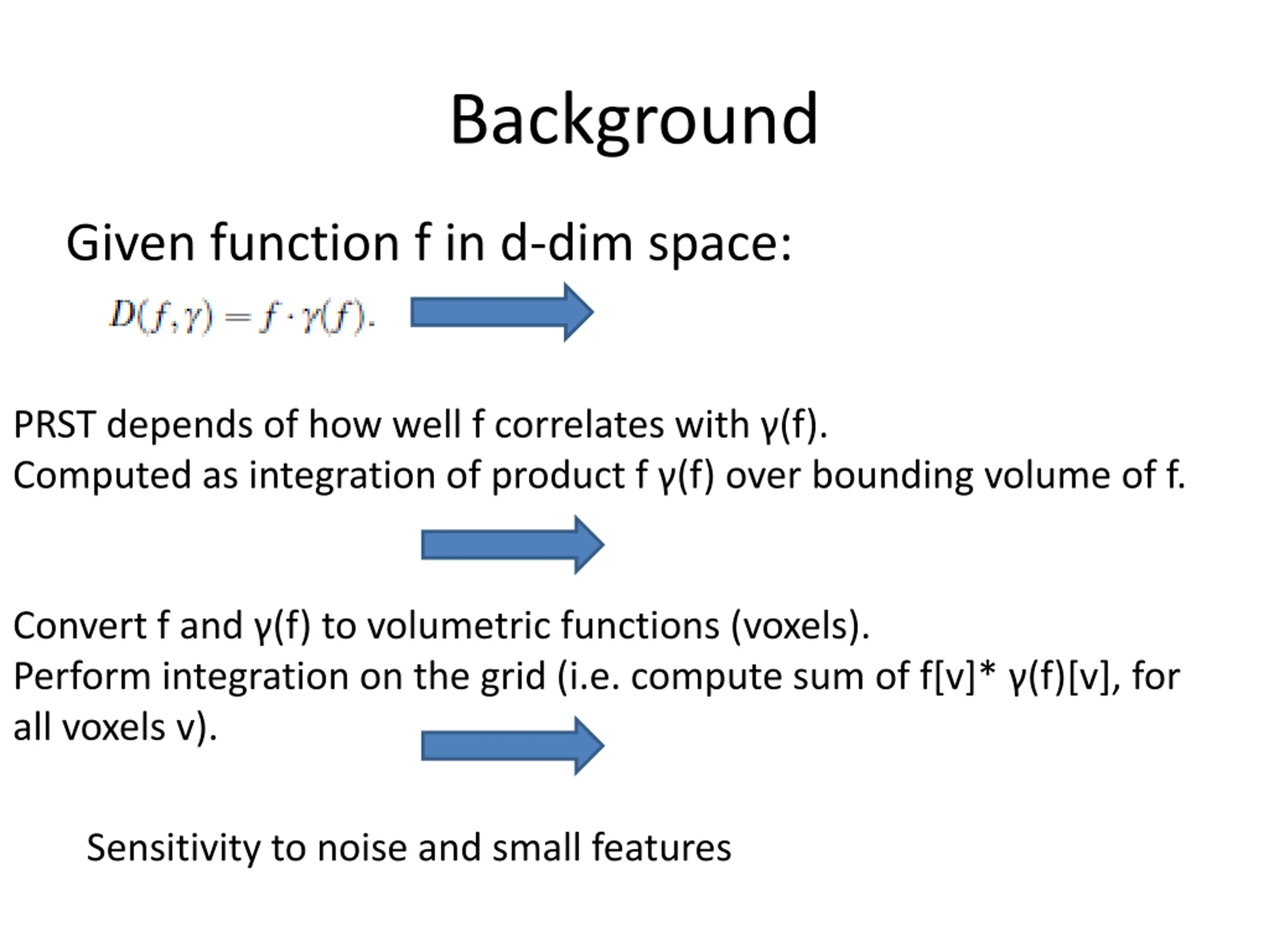 Background Given function f in d-dim space: PRST depends of how well f correlates with (f). Computed as integration of product f (f) over bounding volume of f. Convert f and (f) to volumetric functions (voxels). Perform integration on the grid (i.e. compute sum of f[v]* (f)[v], for all voxels v). Sensitivity to noise and small features