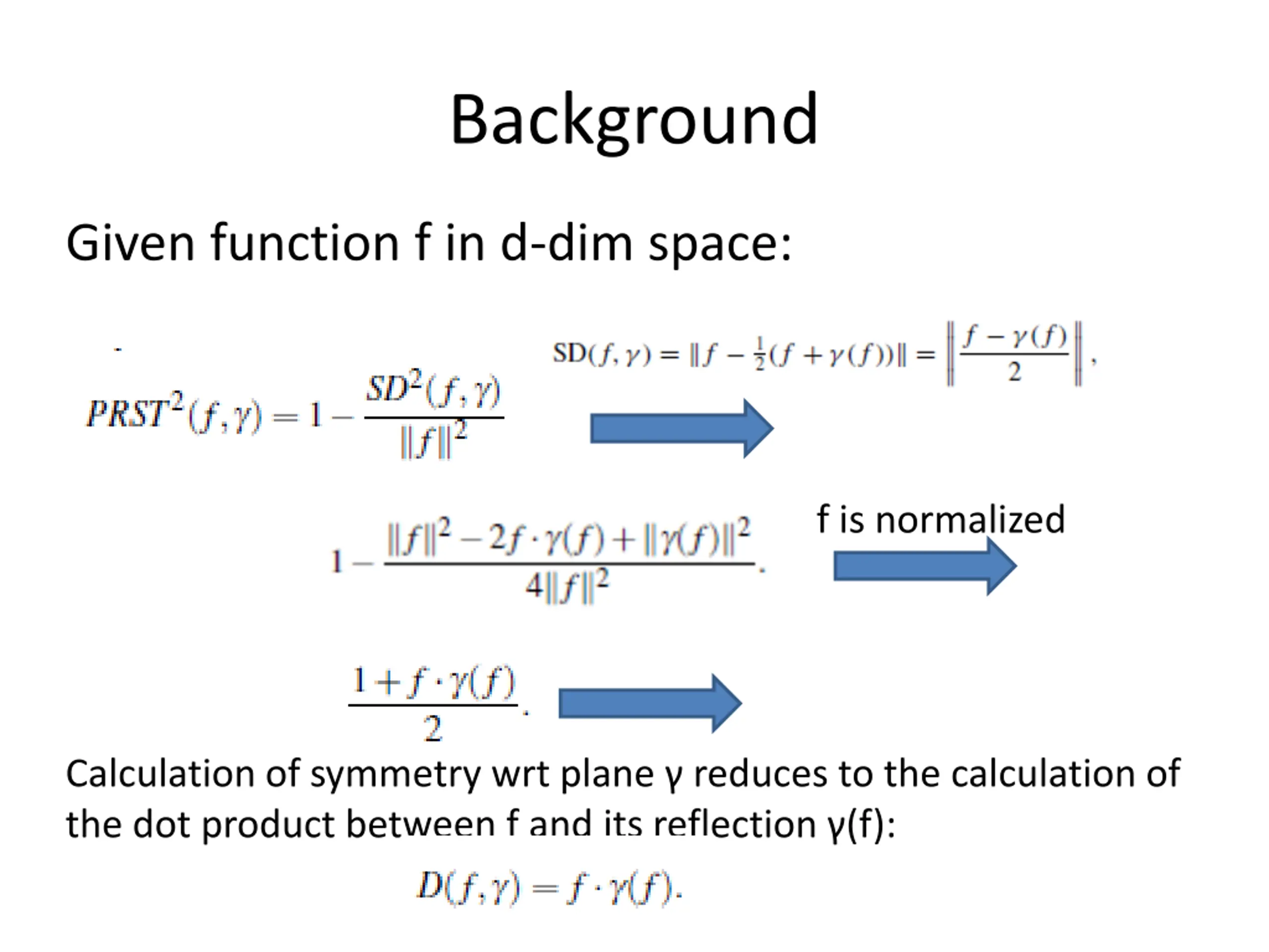 Background Given function f in d-dim space: f is normalized Calculation of symmetry wrt plane reduces to the calculation of the dot product between f and its reflection (f):